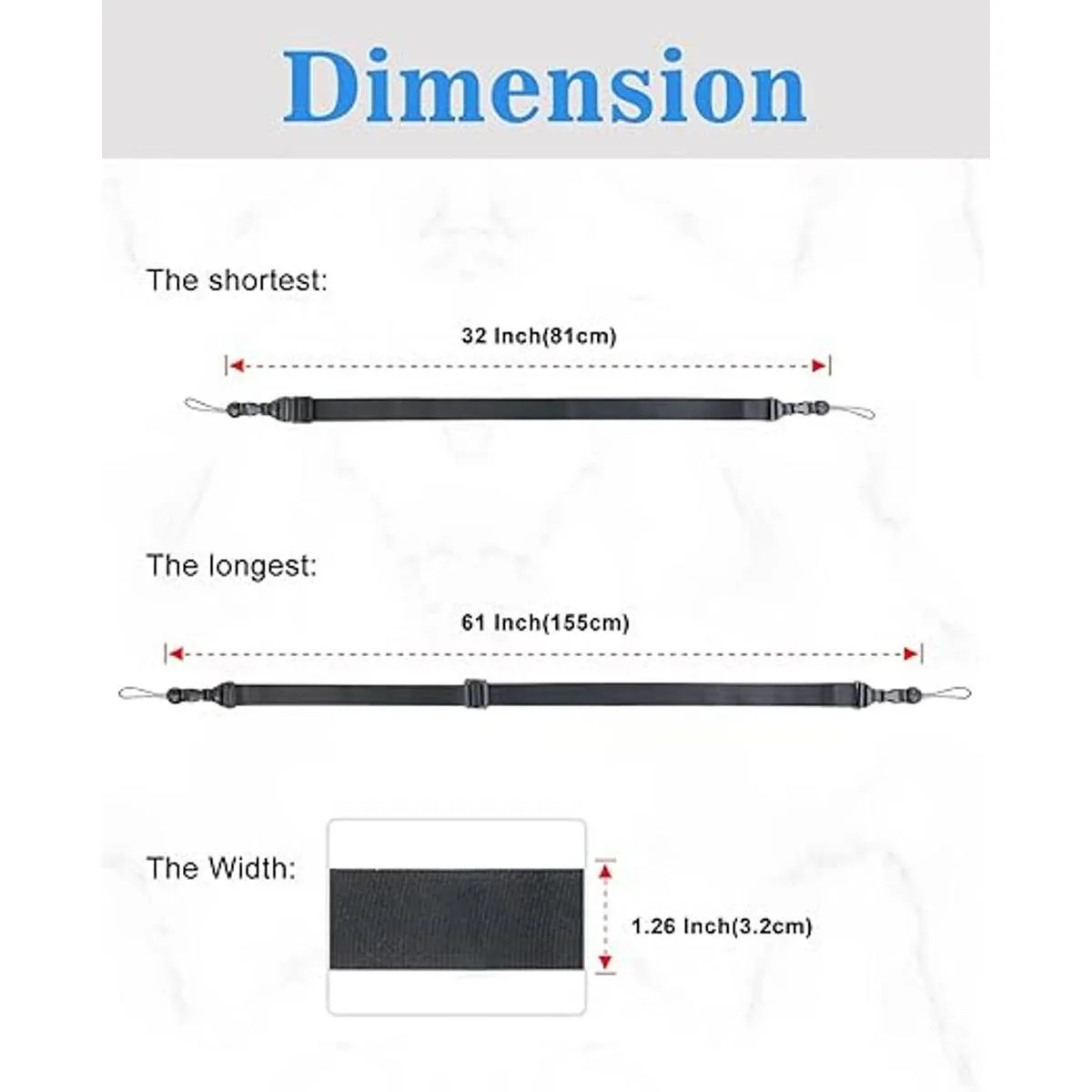 Tamaño: ancho de la correa: 1.26 pulgadas. La longitud de la correa de hombro se puede ajustar de 32 a 61 pulgadas. Se puede ajustar de acuerdo a tus necesidades, muy flexible