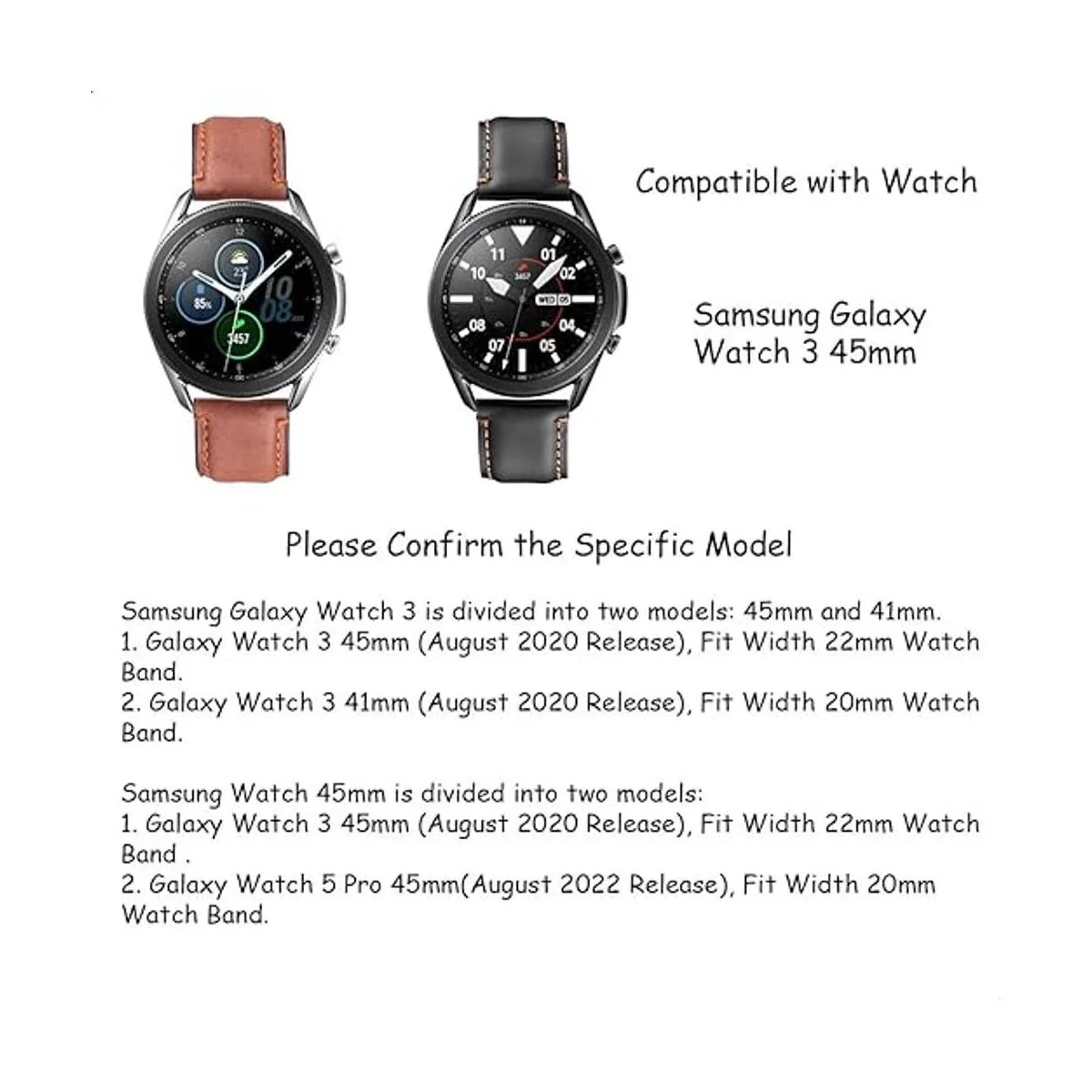 Confirma el modelo específico: Samsung Galaxy Watch 3 se divide en dos modelos: 1.772 in y 1.614 in. 1. Galaxy Watch 3 de 1.772 in versión agosto de 2020, correa de reloj de 0.866 in de ancho. 2. Galaxy Watch 3 de 1.614 in versión agosto de 2020, correa de reloj de 0.787 in de ancho. Samsung Watch 1.772 in se divide en dos modelos: 1. Galaxy Watch 3 de 1.772 in versión agosto de 2020, correa de reloj de 0.866 in de ancho. 2. Galaxy Watch 5 Pro de 1.772 in versión agosto de 2022, correa de reloj de 0.787 in de ancho.