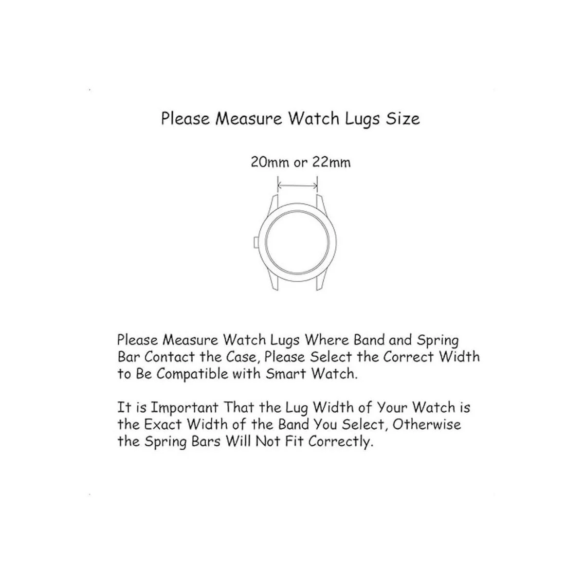 Mide el tamaño de las lengetas del reloj: mide las lengetas del reloj donde la correa y la barra de resorte entren en contacto con la funda, 0.787 in o 0.866 in. Selecciona el ancho correcto para ser compatible con el reloj inteligente. Es importante que el ancho de la lengeta de tu reloj sea el ancho exacto de la correa que selecciones, de lo contrario, las barras de resorte no se ajustarán correctamente.