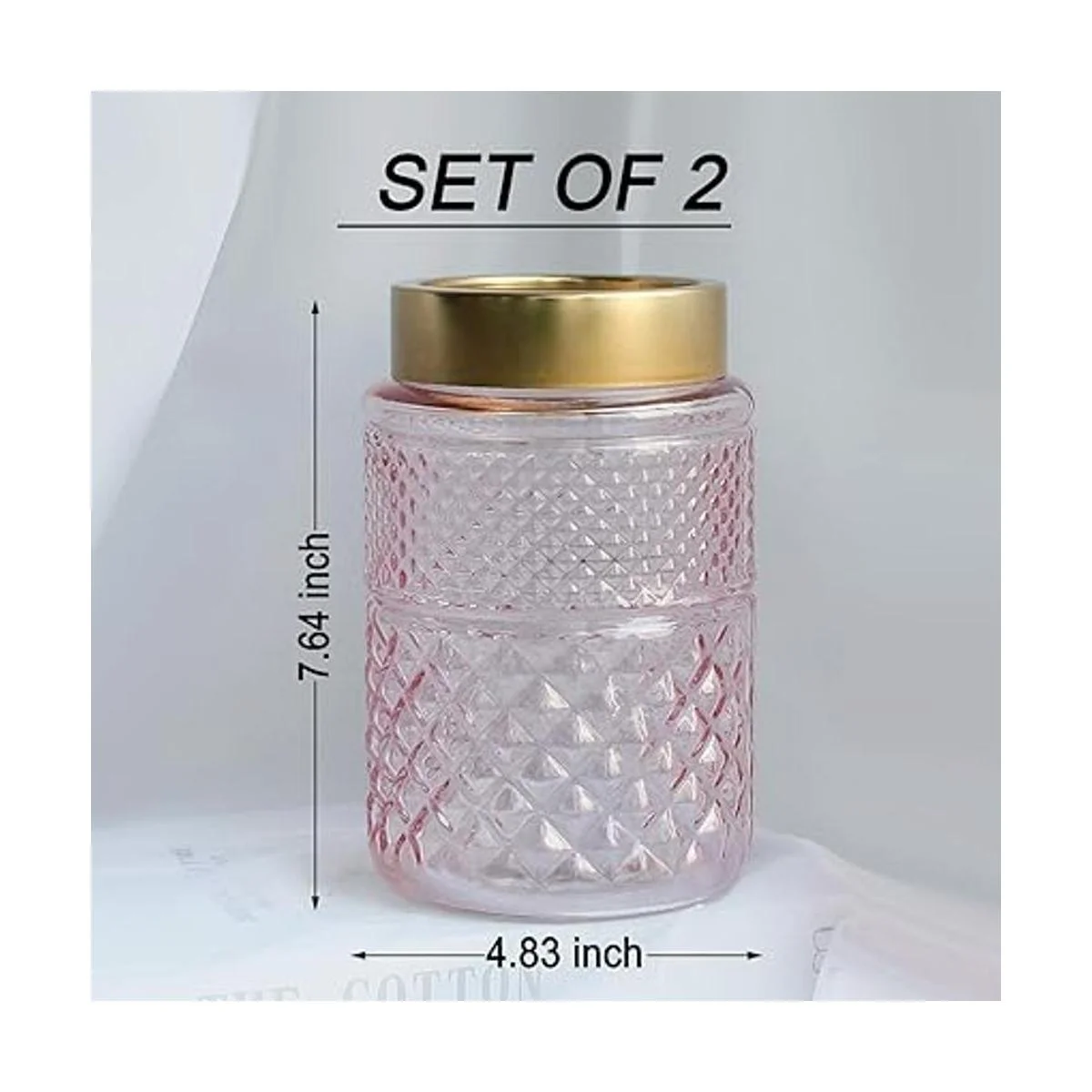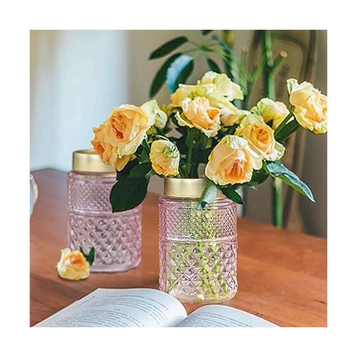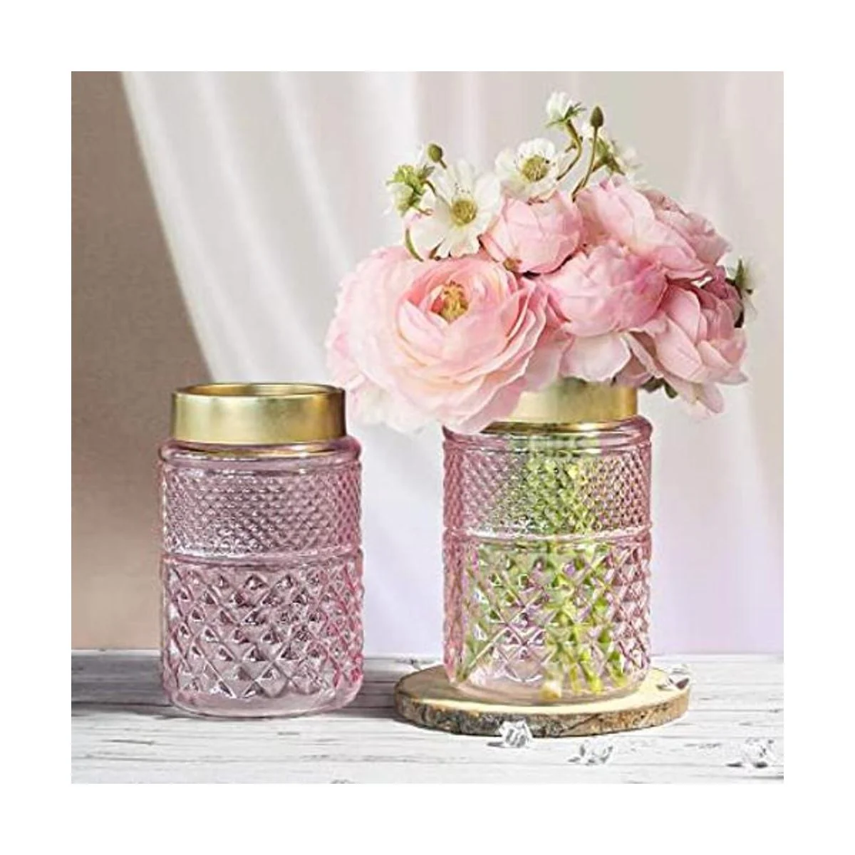 Paquete de 2 floreros de cristal, florero estriado rosa con parte superior de metal dorado, decoración elegante para centro de mesa, cocina, sala de estar, dormitorio, baño, oficina rosa rubor, juego de 2