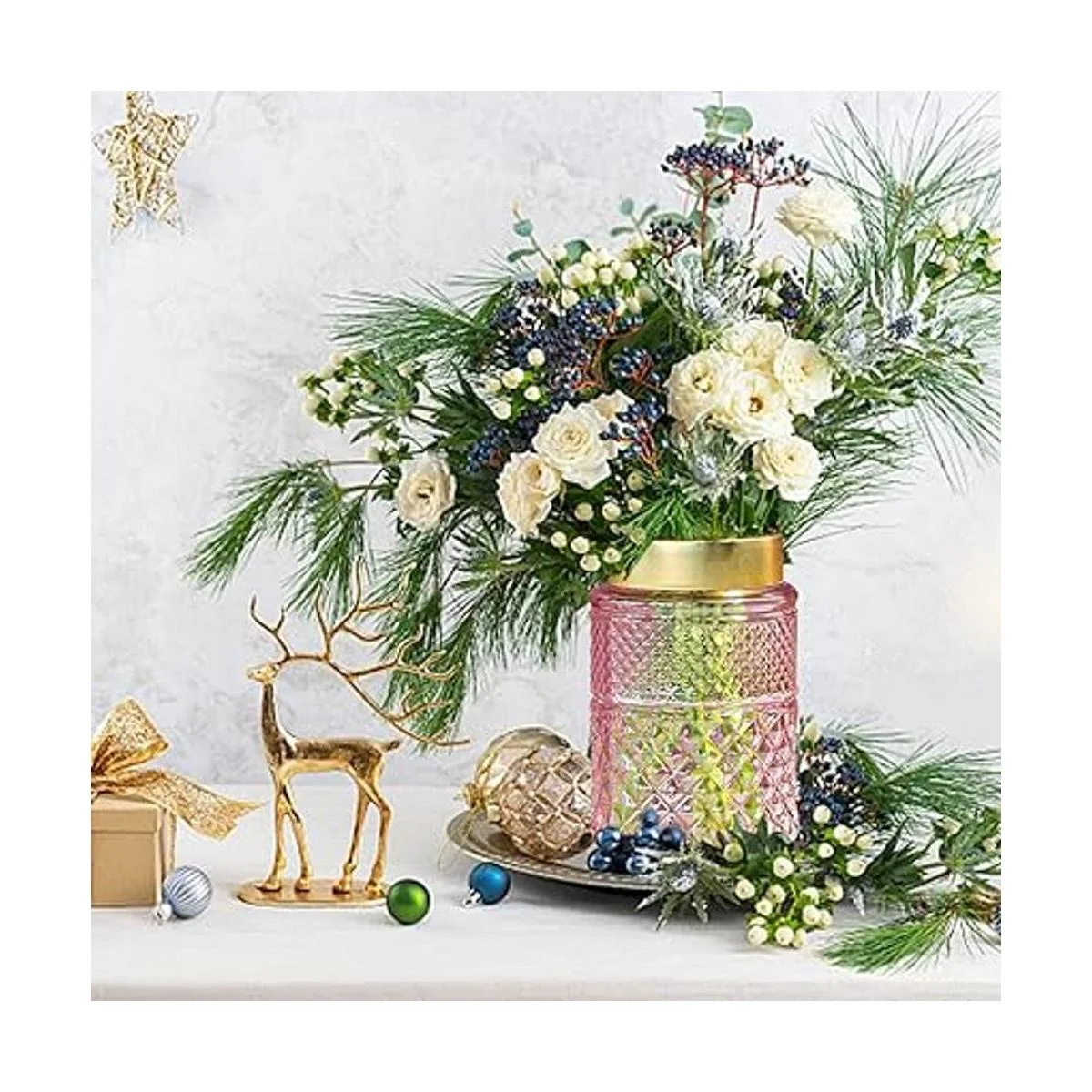 Jarrón de cristal con parte superior de metal El jarrón de cristal con adornos de metal sigue de moda. Elegimos el bonito cristal redondo en relieve que tiene cortes de diamante en la superficie, peinando con la parte superior de metal dorado, para dar al jarrón más acento de moda. Diferentes colores románticos disponibles para tu elección: verde menta, rosa rubor y azul océano.
