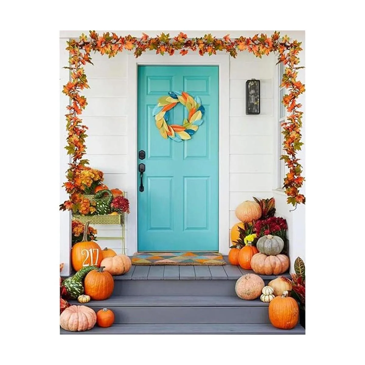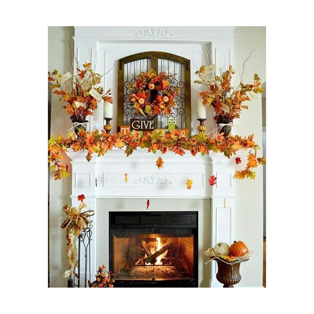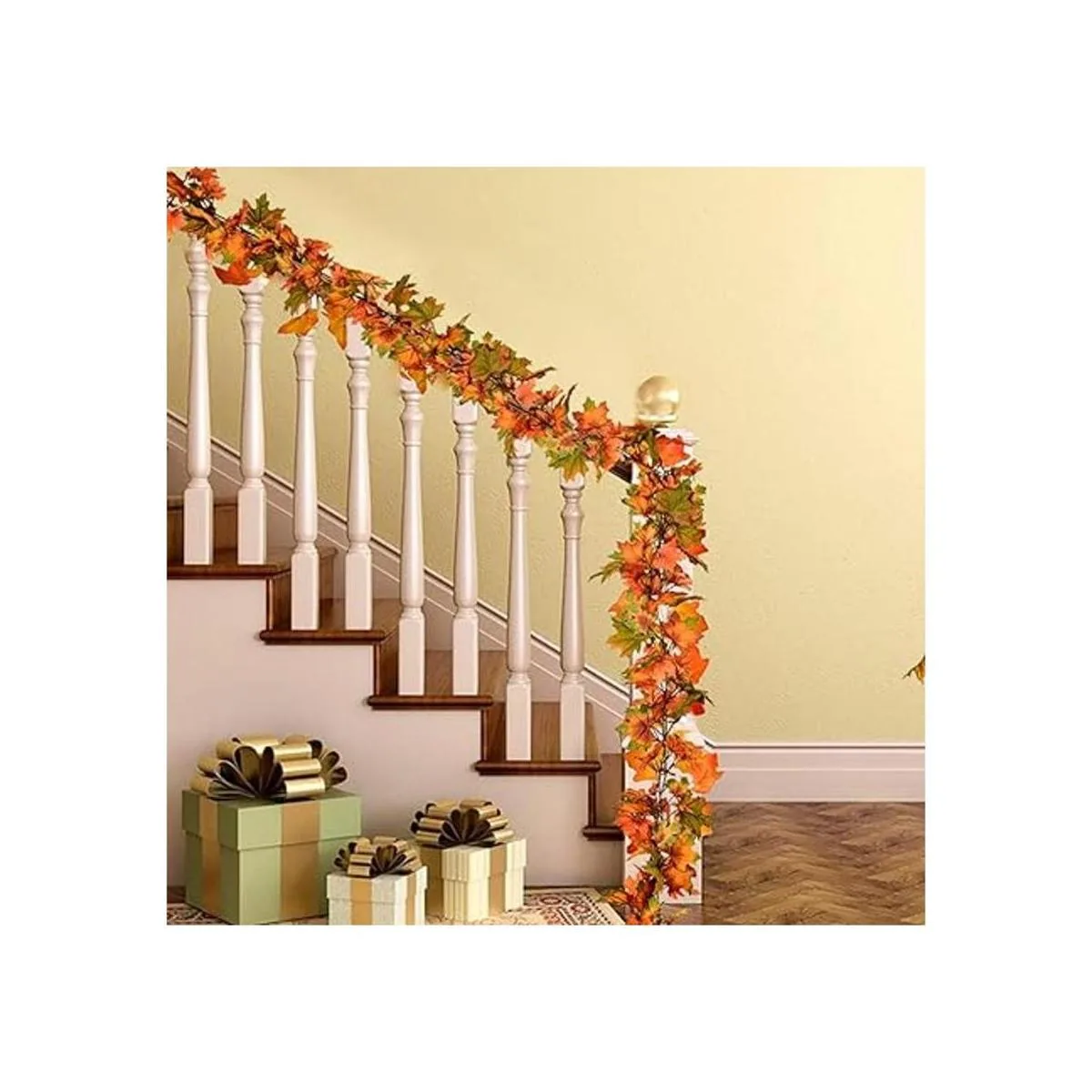 Paquete: 2 guirnaldas de hojas de arce artificiales de 6.5 pies/pieza, longitud total: 13 pies. Las hojas de arce naranja, amarillo y verde y más colores hacen que sea una gran mezcla de colores para calentar cualquier habitación.