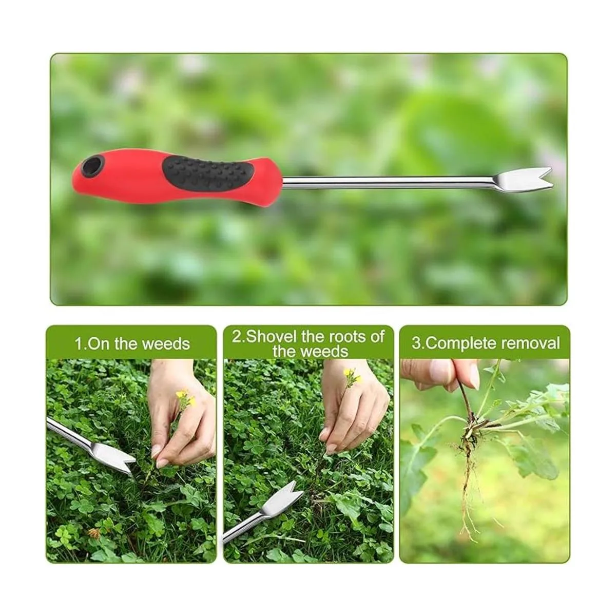 Fácil de usar: esta herramienta de deshierbe de jardinería es fácil y cómoda de usar, solo tienes que poner la base de metal en la raíz de las malas hierbas, hacer palanca suavemente para eliminar las malezas, flores u otras plantas