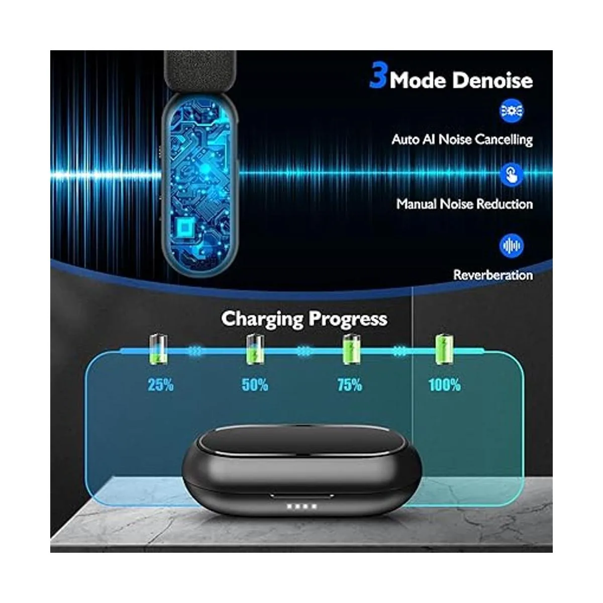Cuál es la ventaja sobre otros Micrófono inalámbrico WM300 con funda de carga, adopta 3 modos diferentes de reducción de ruido. Su propio chip de reducción de ruido activo inteligente integrado, que te permite grabar claramente en entornos ruidosos. Además de su función de cancelación automática de ruido de IA, hay modo de reducción de ruido manual y reverberación para seleccionar y micrófono de cancelación de ruido real. Batería recargable integrada de 60 mAh, funciona hasta 7 horas con una sola carga de 1,1 horas. Y tiene 4 luces indicadoras en la funda de carga para informar claramente al usuario la potencia restante del 25 50 75 y 100 en consecuencia