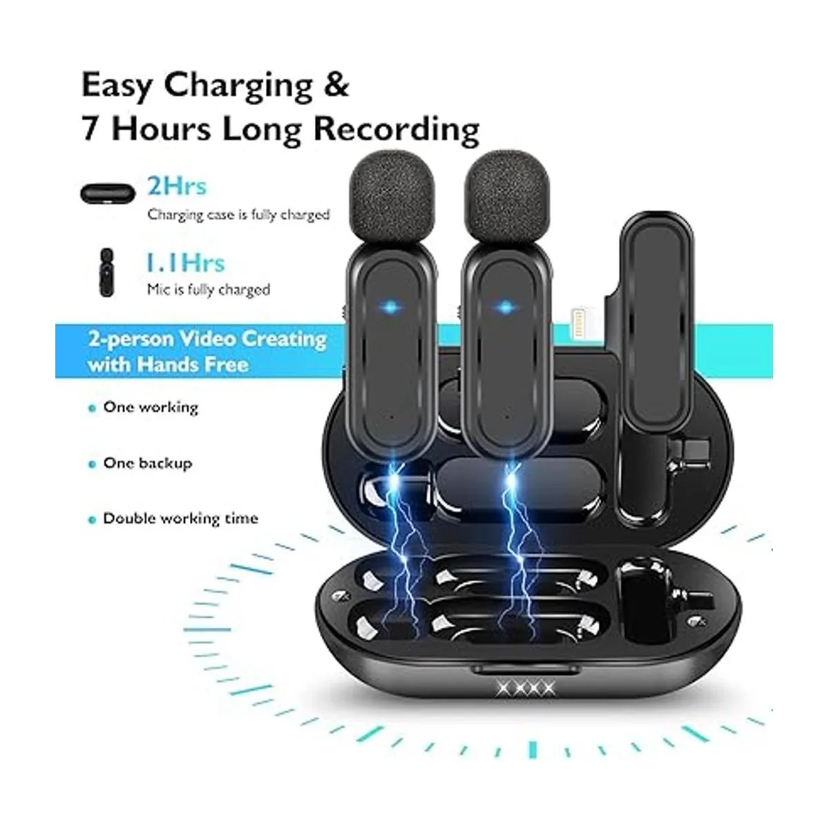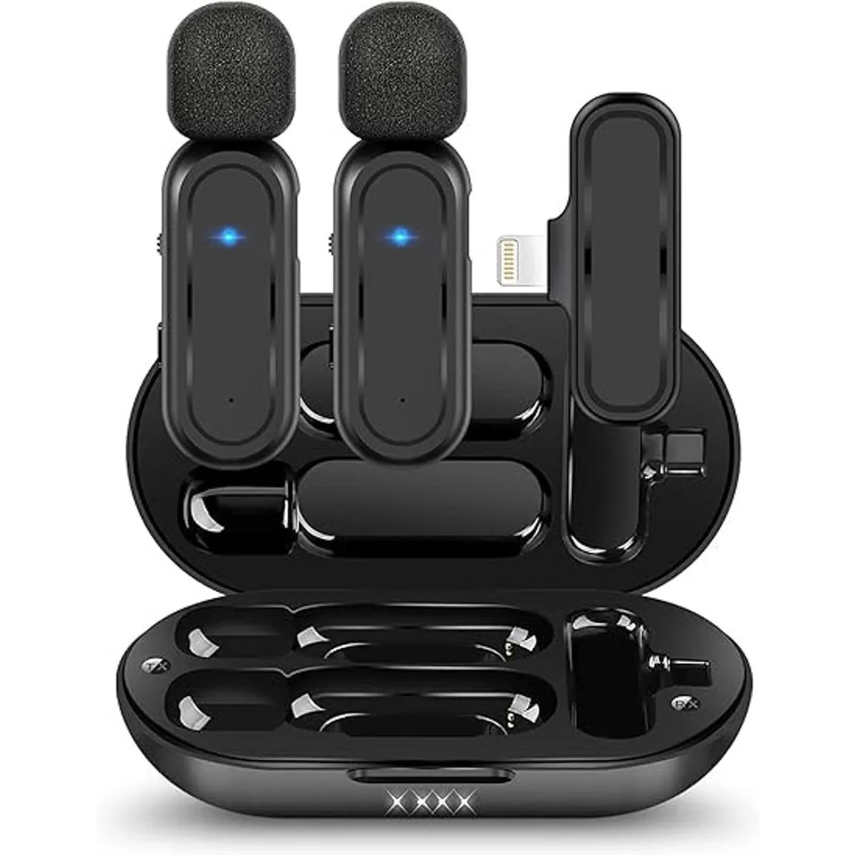 Paquete de 2 micrófonos Lavalier inalámbricos para iPhone iPad con funda de carga, micrófono de solapa con clip de 7H inalámbrico para grabación de video, vlogging, YouTube, entrevista, 3 modos de Denoise, 70 pies