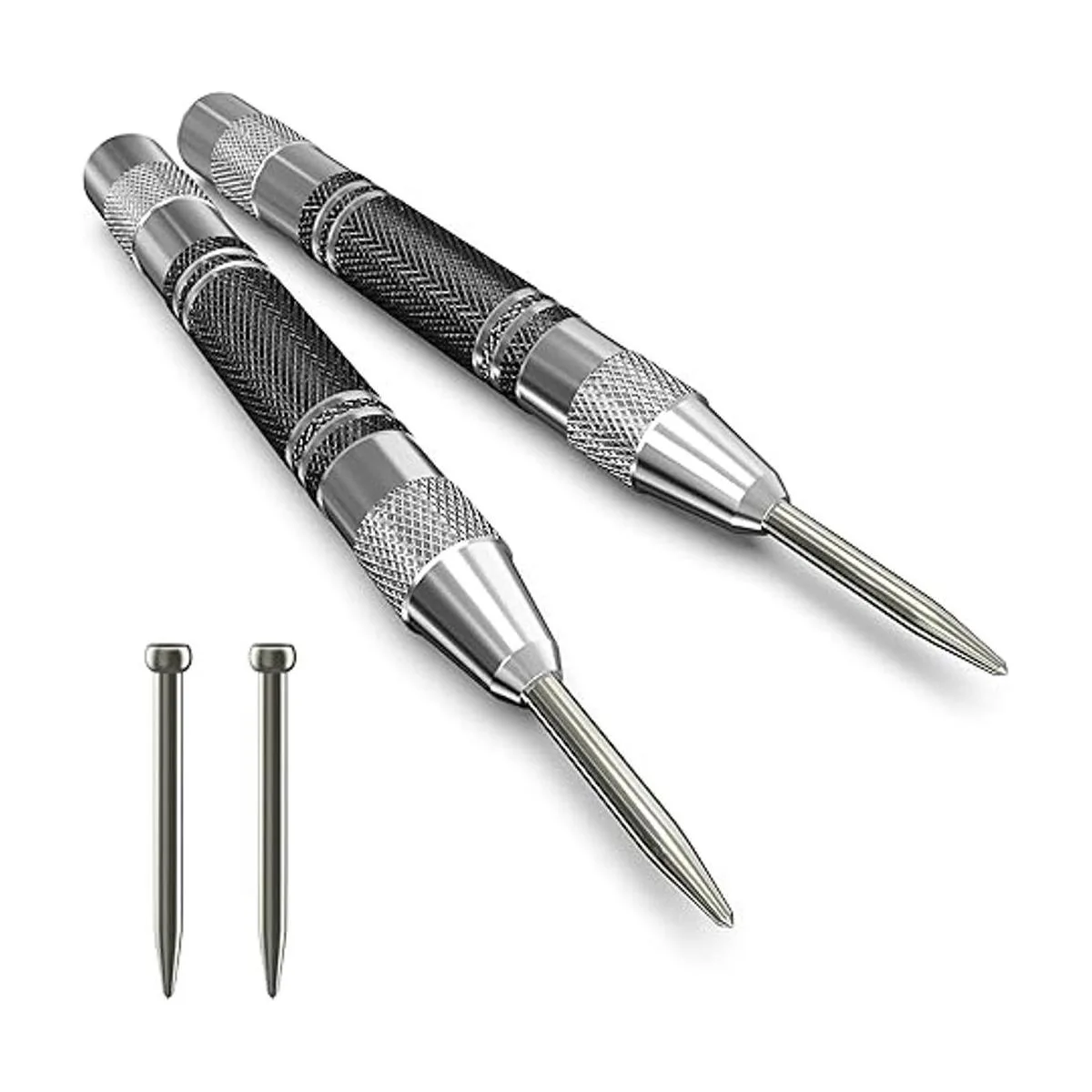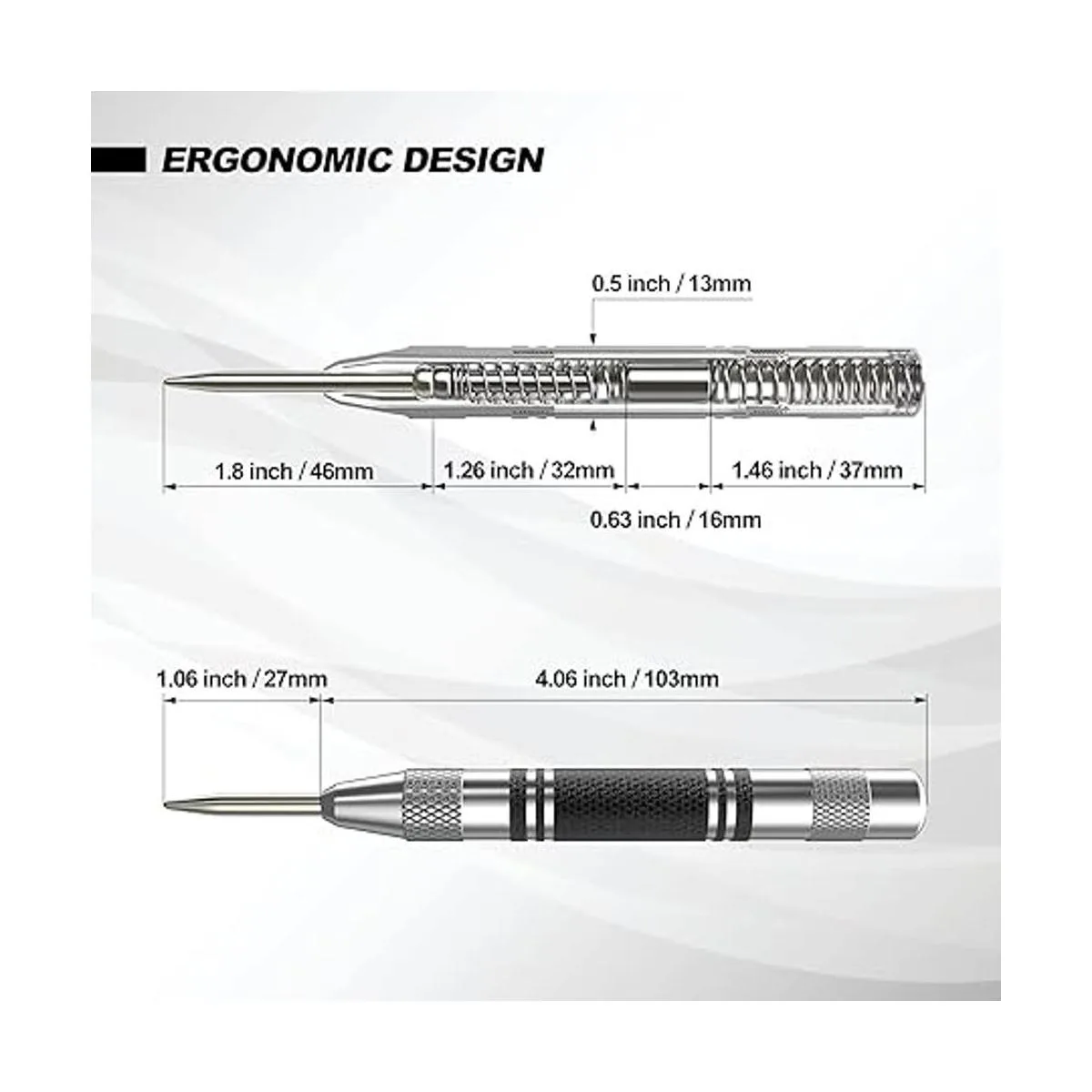 El paquete incluye: 2 perforadores centrales automáticos de alta resistencia de 5 pulgadas y 2 agujas de repuesto, tamaño portátil, herramientas de perforación antideslizantes con resorte que pueden ser marcados y posicionados precisos sin martillo, ahorran tiempo y energía.