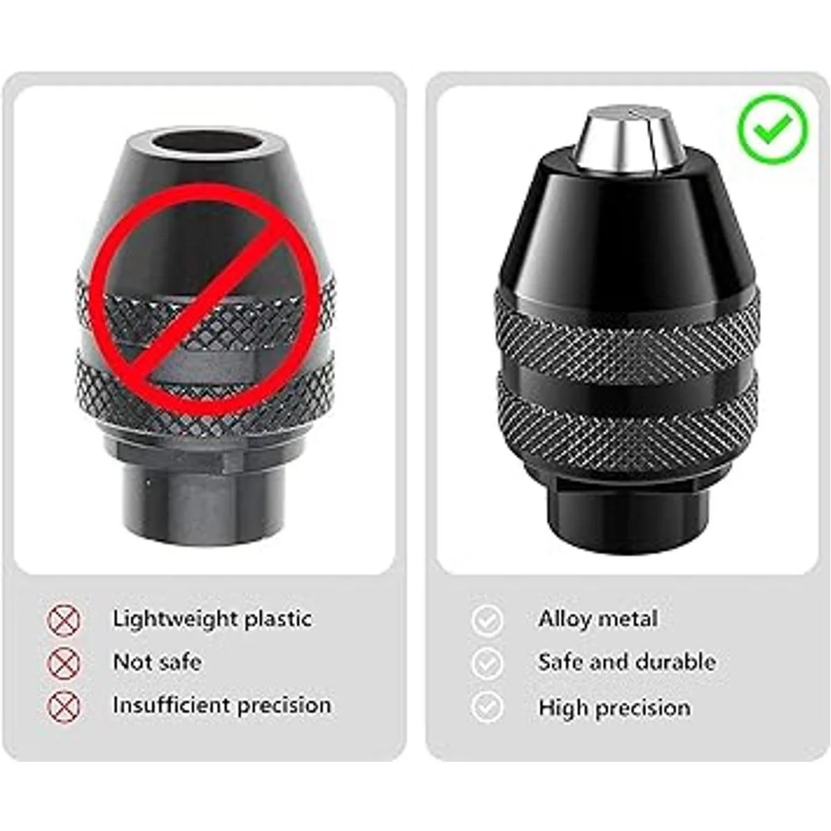 Diseño de estructura de una sola pieza, material de aleación, resistente y duradero, más seguro que los modelos de plástico. El portabrocas de 3 mandíbulas está bien hecho, y el resorte integrado es estable y duradero.