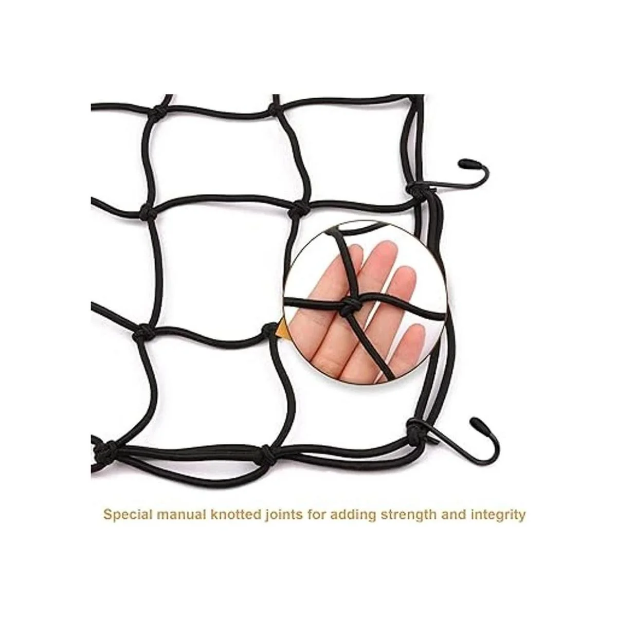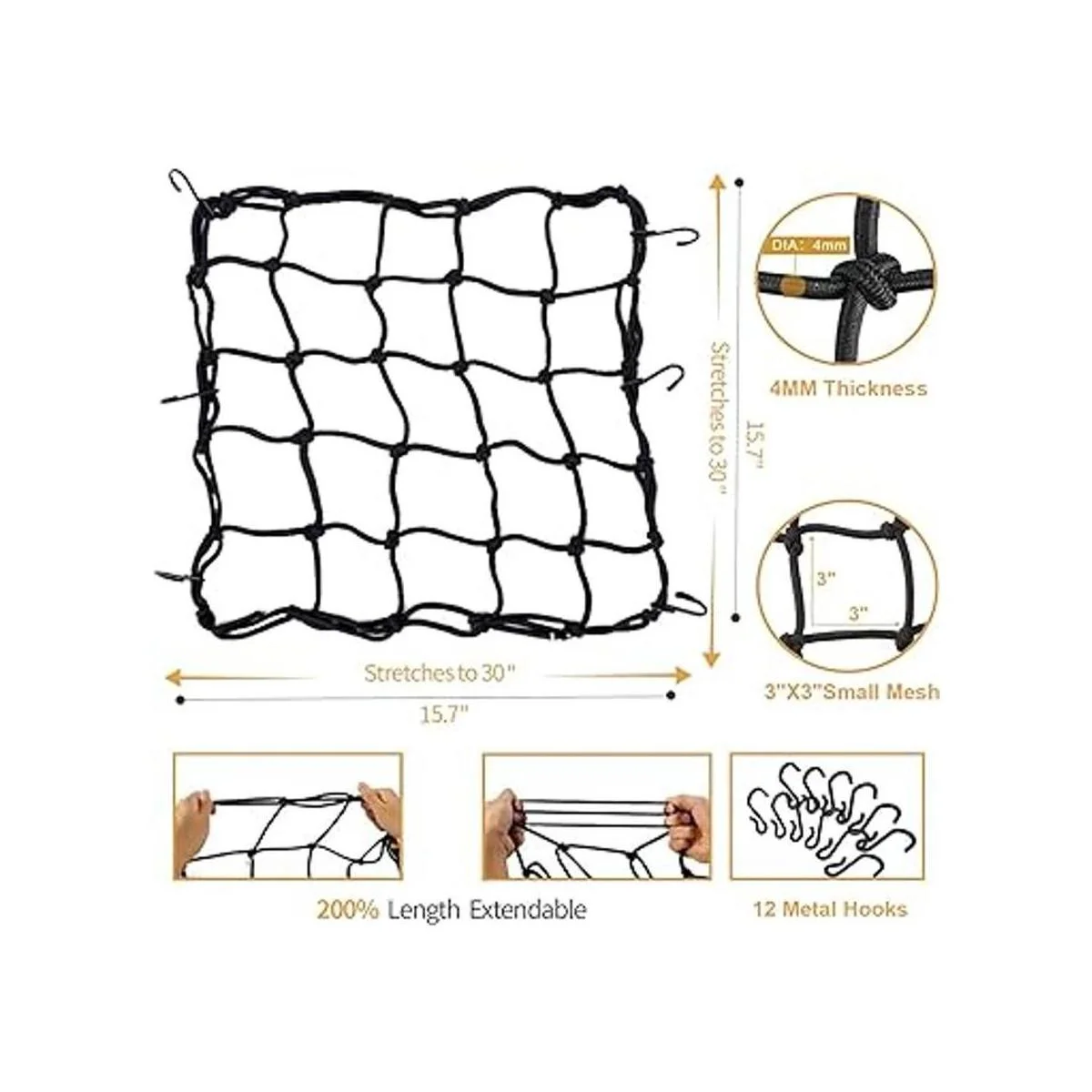 Adecuado para todas las ocasiones: tamaño de red de equipaje de 15.7 x 15.7 pulgadas, se estira hasta 30 x 30 pulgadas, puedes ampliar el espacio de transporte y cargar más artículos con nuestra red de carga. Ideal para asiento trasero de motocicleta, juego trasero de bicicleta, cesta de bicicleta, tanque de combustible, casco fijo, tabla de remo, moto de nieve para sostener carga, equipaje, cesta, casco, etc