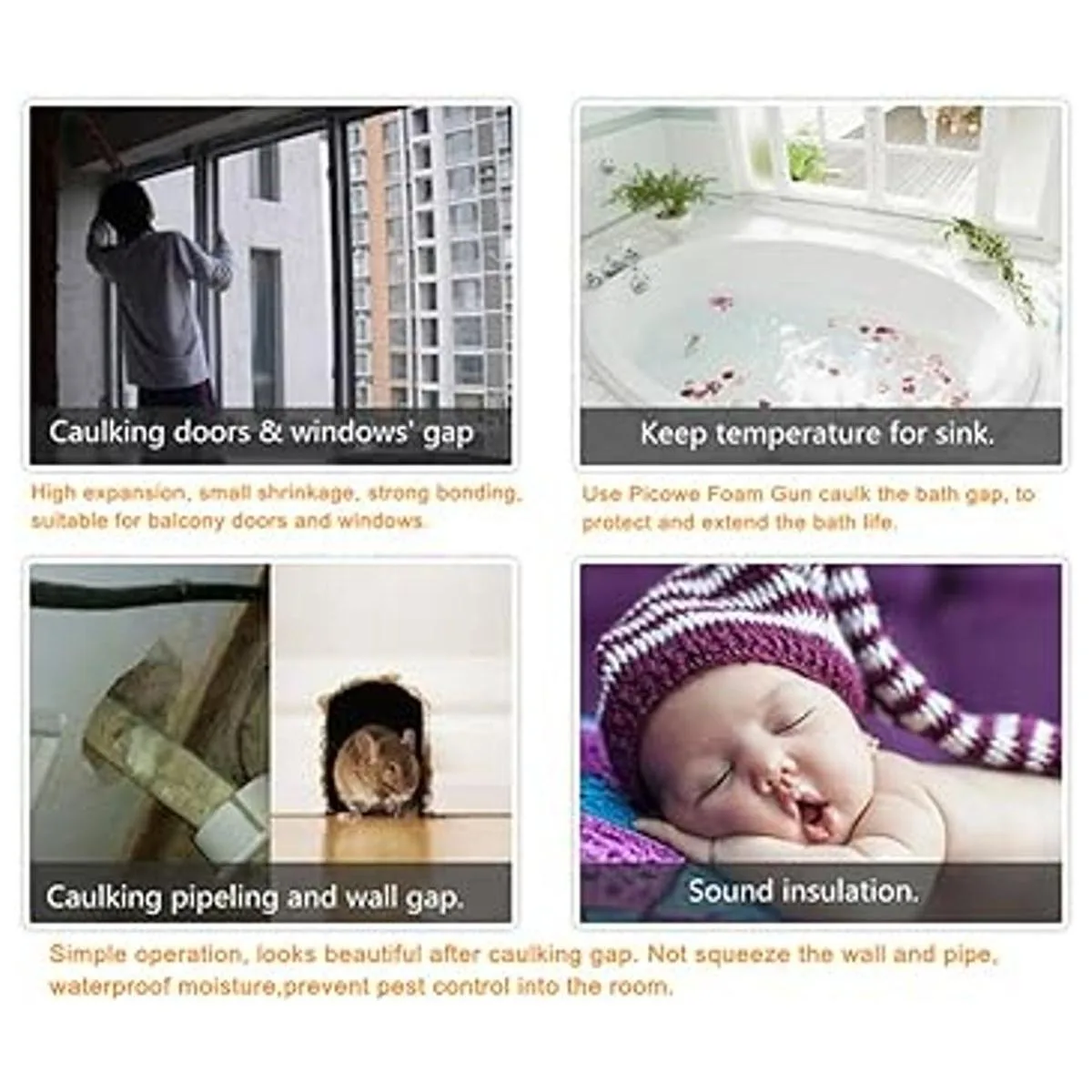 Ampliamente utilizado: ideal para rellenar, sellar y aislar pequeños huecos. No aprieta la pared ni el tubo, impermeable. Muy adecuado para puertas de balcón, ventanas, bañera, armario, etc.