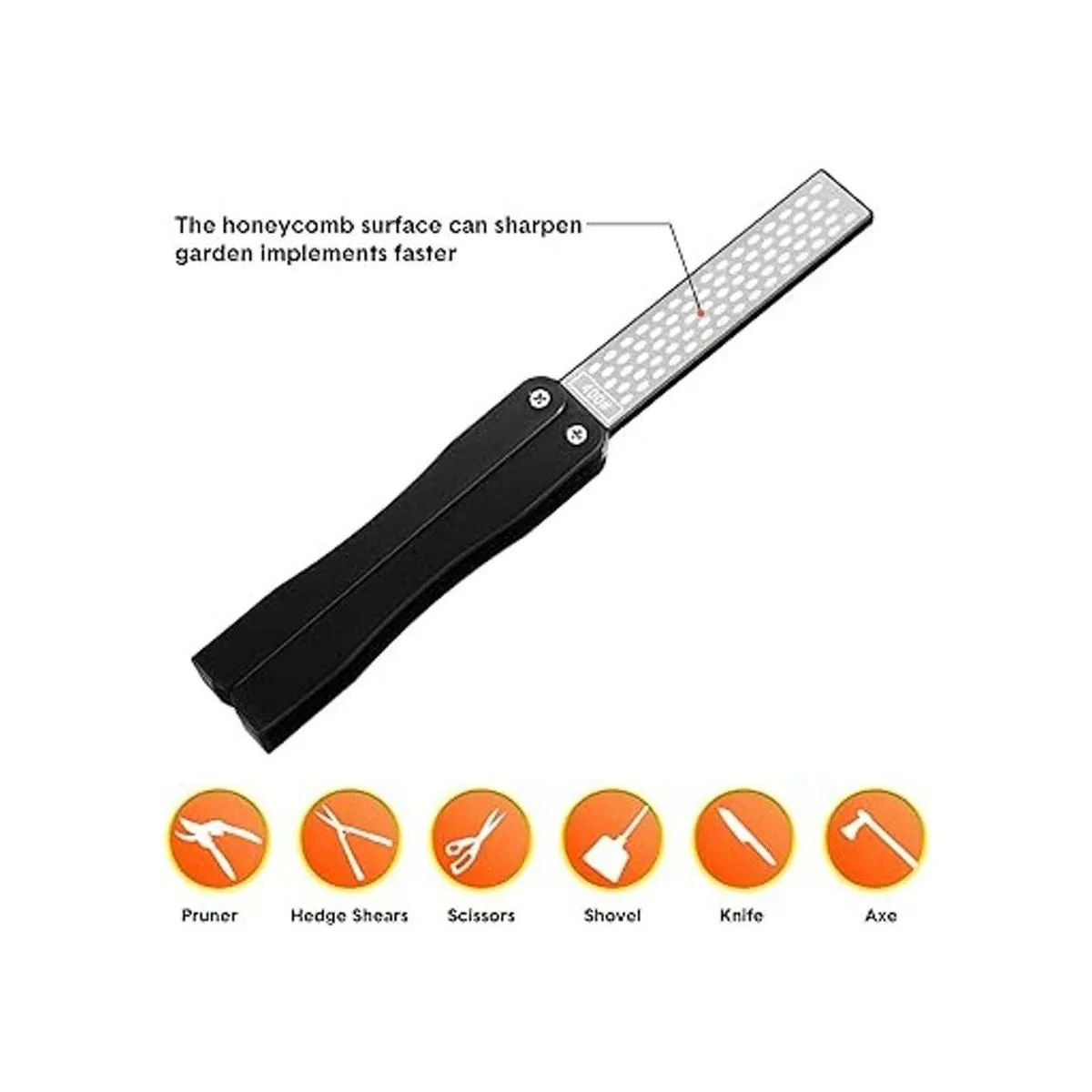 Material: el afilador de herramientas de jardín está hecho de piedra de afilar de diamante chapada en titanio para un uso duradero, mango ABS ligero para mayor comodidad; la superficie de panal puede afilar los implementos de jardín más rápido que las piedras convencionales