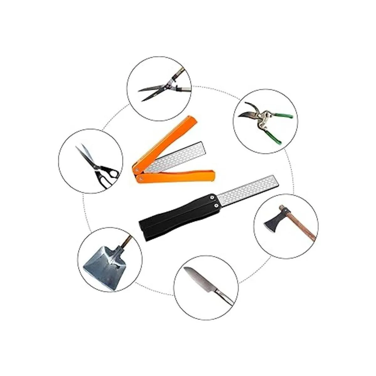 Fácil de usar y transportar: el afilador de cuchillos de bolsillo funciona bien para restaurar y afilar todo tipo de herramientas de jardín, cuchillo, tijeras, etc. Diseño plegable portátil que cabe en el bolsillo o bolsa de herramientas, conveniente para almacenar y transportar