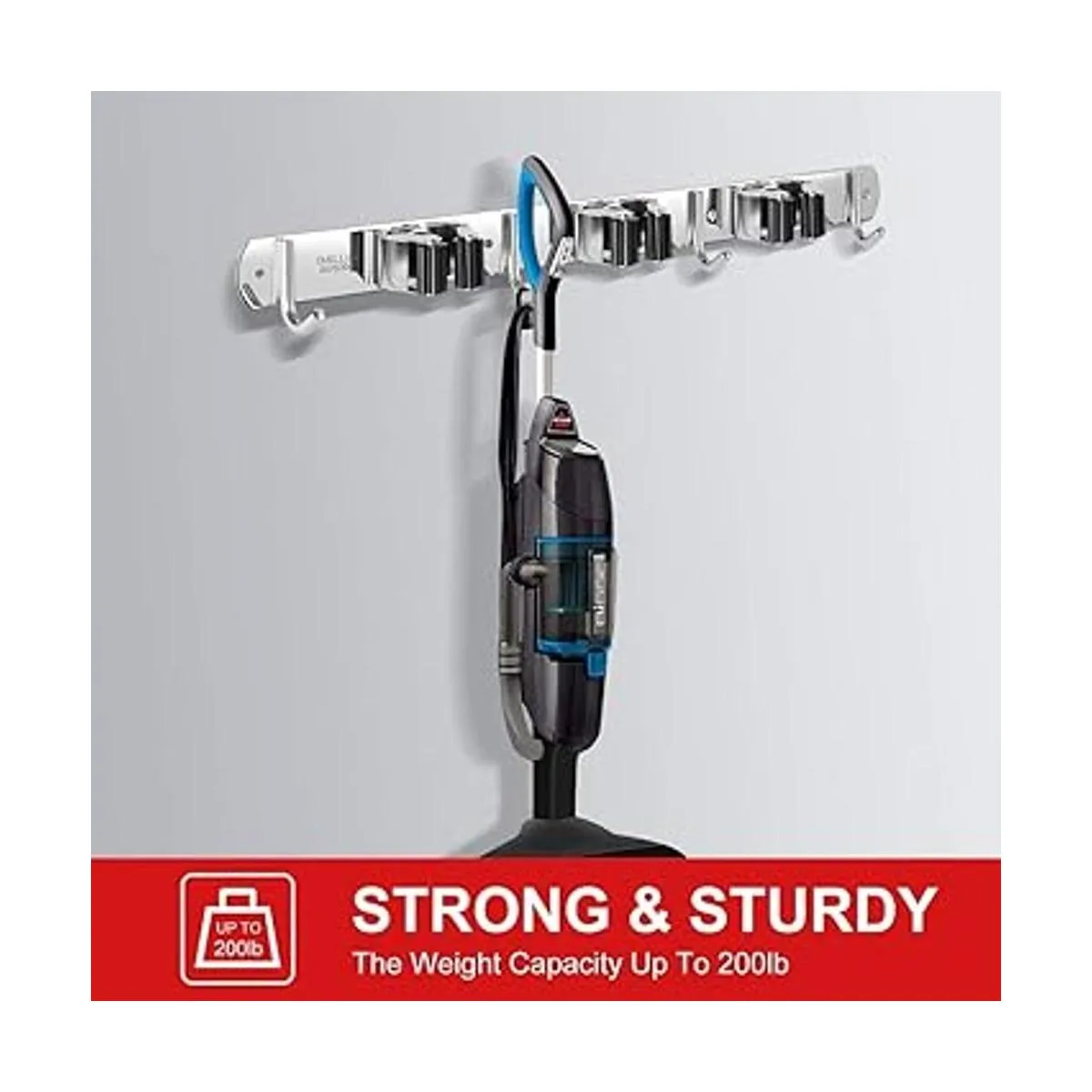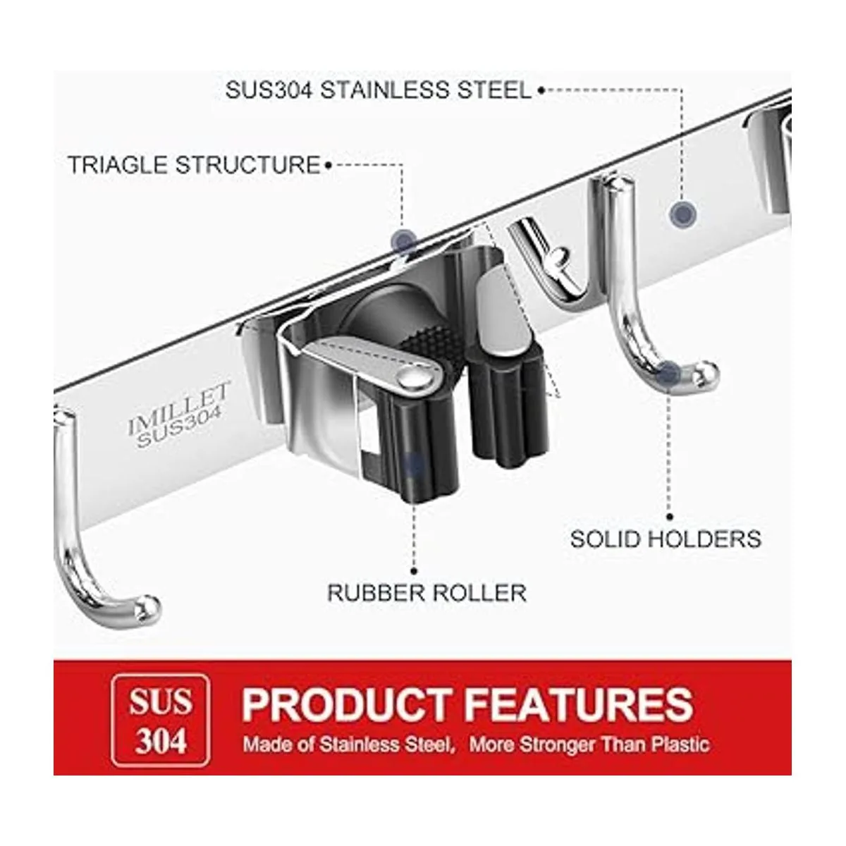 Fuerte y resistente: el soporte de pared organizador de escobas está hecho de acero inoxidable 304, resistente a la corrosión, a prueba de humedad y al agua. En comparación con el estante de escobas de plástico, es más fuerte y duradero. Y este soporte de pared para colgar escobas puede soportar hasta 200 libras.