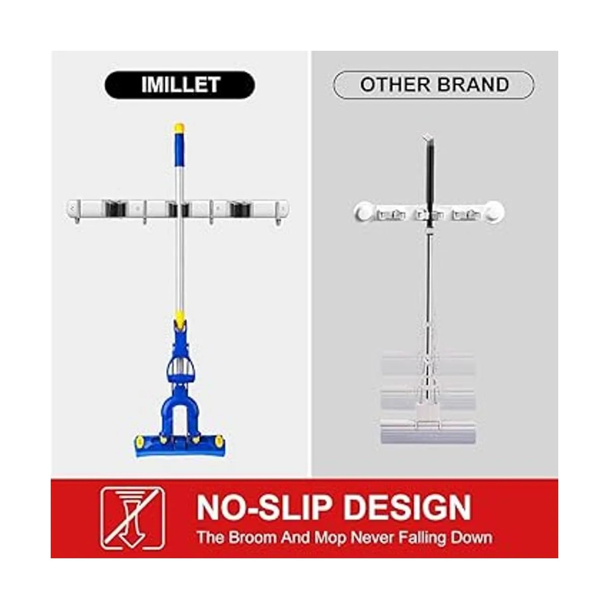 Paquete de 2 soportes IMILLET para escoba y trapeador para montaje en pared, soporte para escoba de acero inoxidable, soporte para trapeador autoadhesivo, ganchos resistentes, organizador de almacenamiento para el hogar, lavandería, jardín, garaje 5 estantes con 4 ganchos