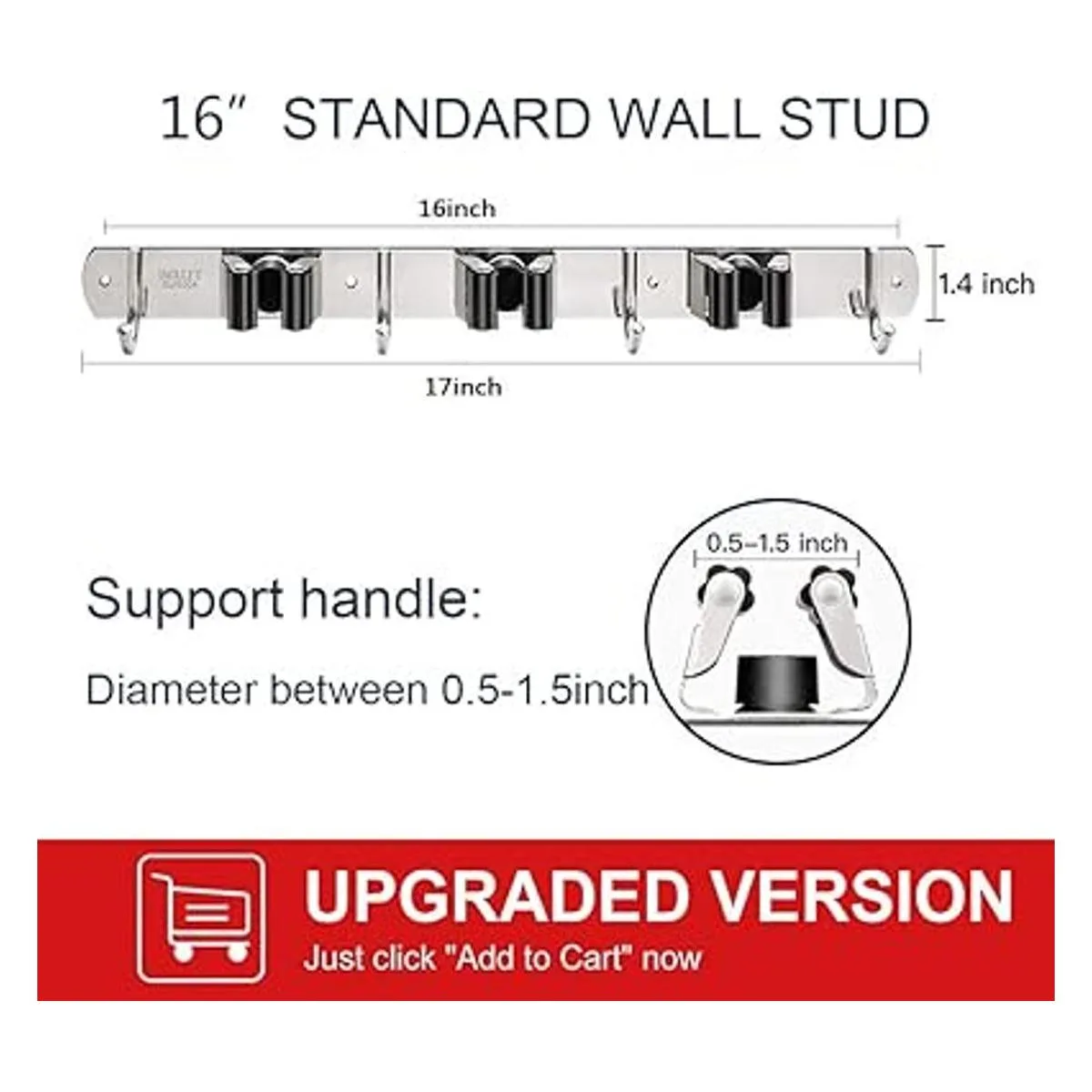 Actualización 2020: el tamaño del soporte para escobas es de 17 x 1.4 x 0.08 pulgadas. La distancia del agujero de instalación se basa en el espaciado estándar de 16 pulgadas para la colocación de los pernos. 4 agujeros de montaje y juego de tornillos hacen que el soporte de fregona sea más resistente en la pared. Incluye anclajes que se adaptan a la mayoría de todo tipo de paredes.
