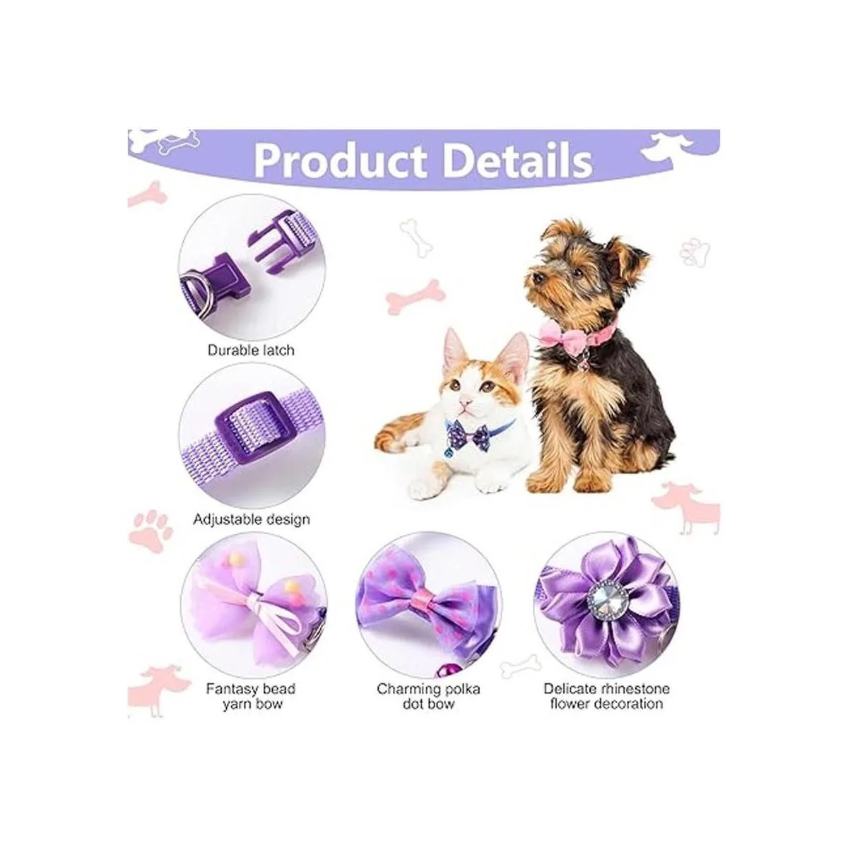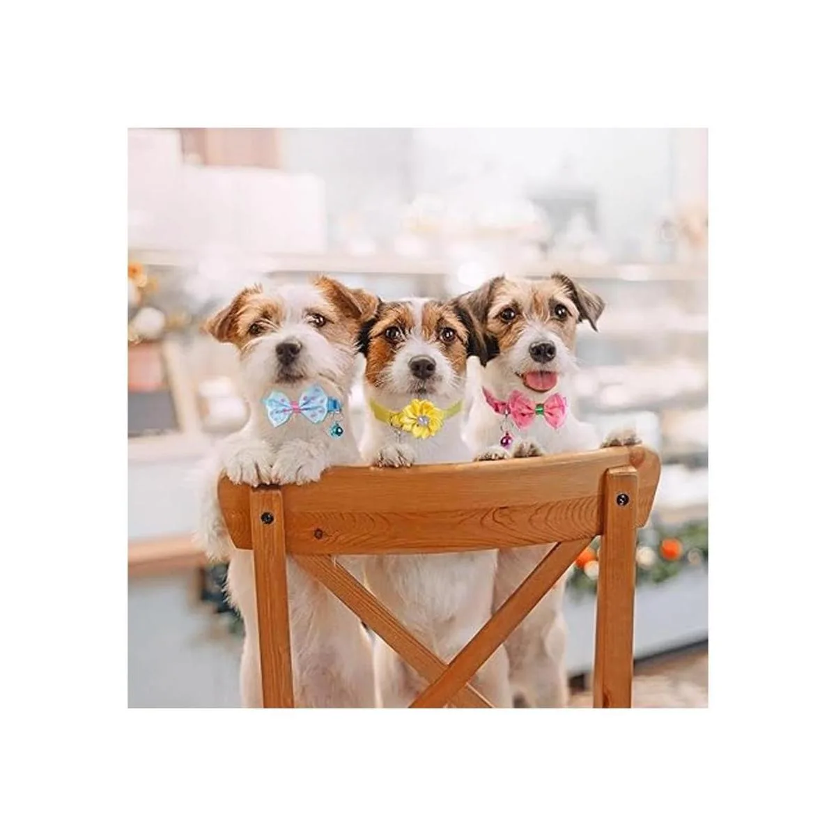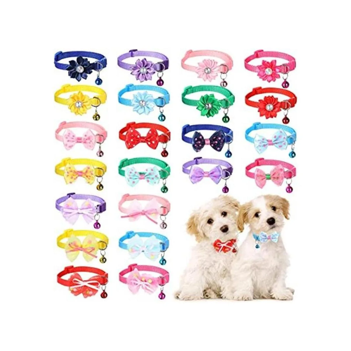 Cuello de 3 estilos: los collares de aseo para perros tienen 2 diseños diferentes, incluyendo flores de diamantes de imitación, coloridos lazos de cuentas y lazos de lunares, que son exquisitos y delicados; también vienen con colores brillantes como azul, rosa, verde, rojo, amarillo, morado, etc. para que tus mascotas sean más elegantes y atractivas