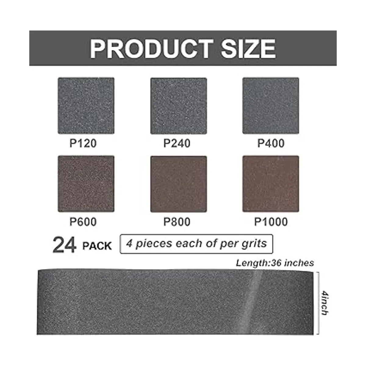 Paquete de 24 correas de lijado de 4 x 36 pulgadas grano 1202404006008001000 correas de lijado de óxido de aluminio de alto rendimiento, kit de correa de afilador de cuchillos para carpintería, pulido húmedo y seco