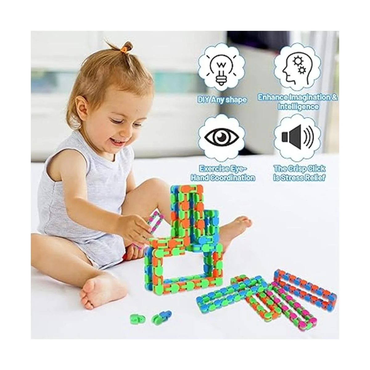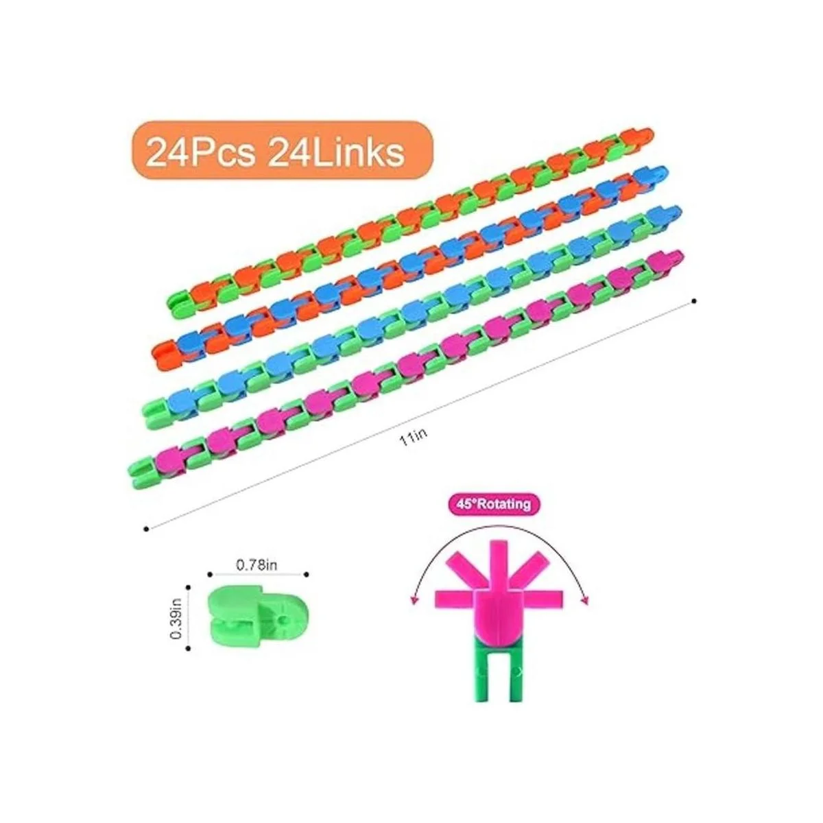 Cada uno de los 24 eslabones en el juguete de pistas locas gira y bloquea en 5 posiciones, puedes intentar convertirlos en letras, números, etc. Mantén tus dedos ocupados y concentrados