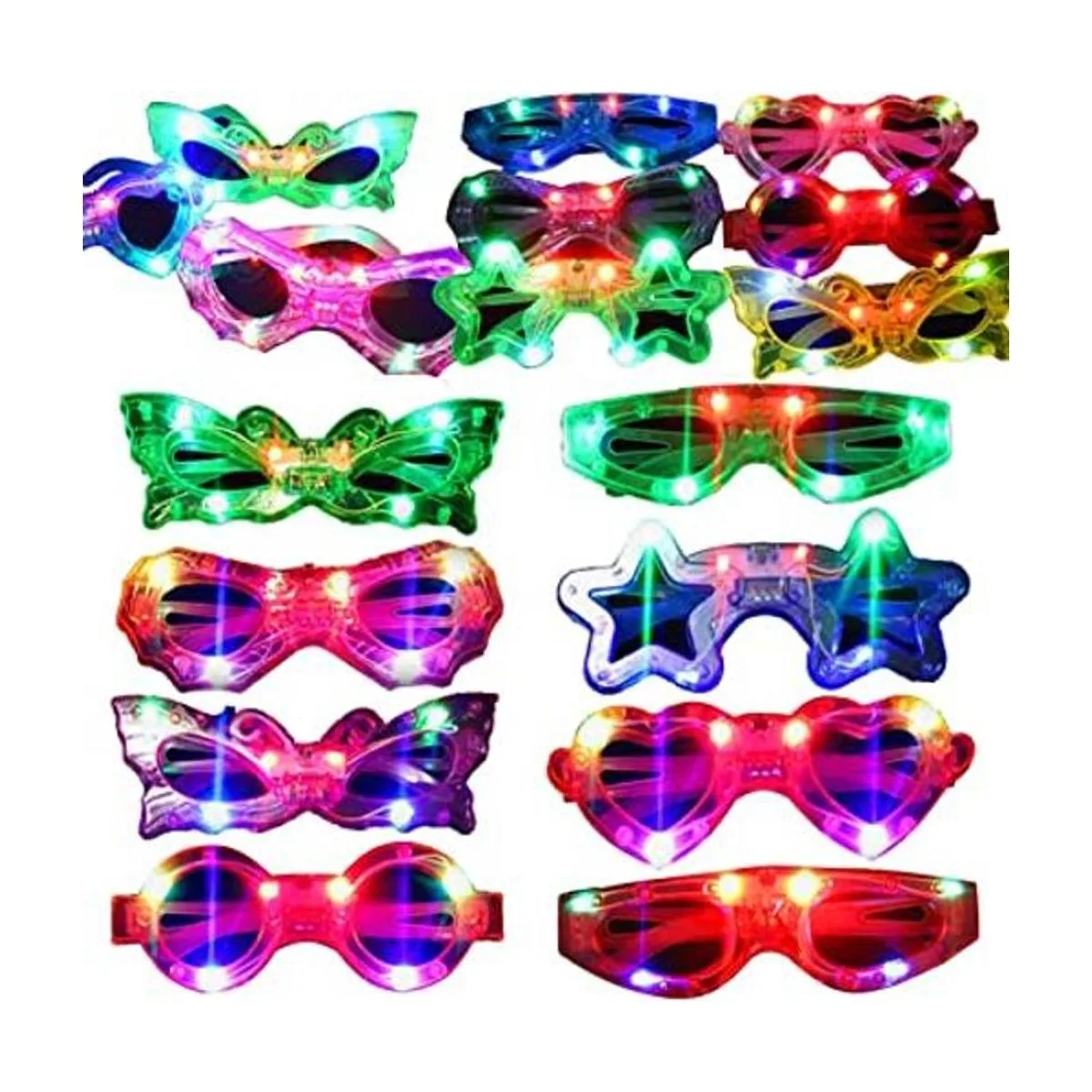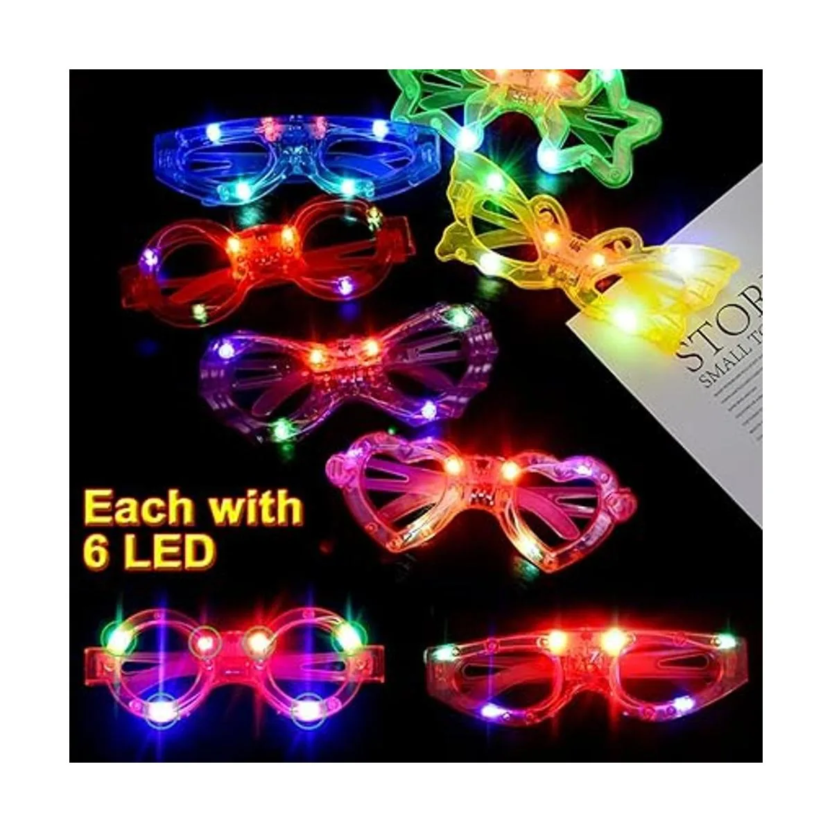 Tienen 6 formas Nuestras gafas tienen 6 formas, son círculo, corazón, mariposa, elipse, estrella, telaraña y cada forma tiene 2 colores el color es aleatorio. Simplemente enciende y apaga el botón. Cada vaso LED de fiesta está envuelto individualmente e incluye baterías para que funcionen de inmediato. Estamos aquí para cambiar el juego de suministros de fiesta brillante ofreciendo nada más que lo mejor