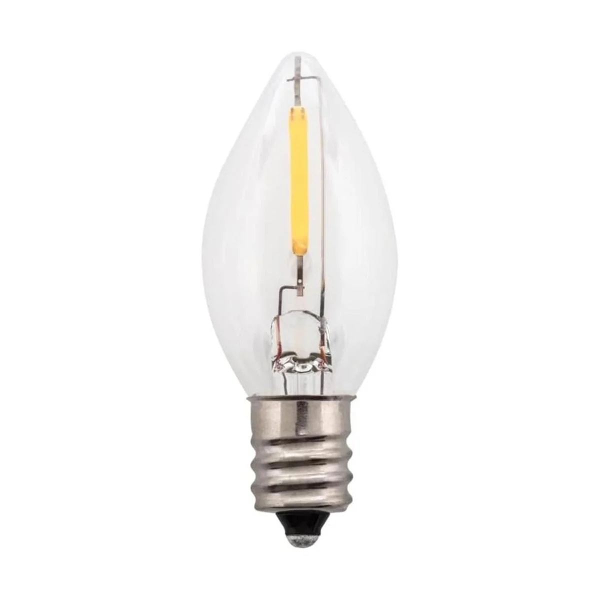 Especificaciones: paquete de 25 bombillas LED de filamento Edison individuales son C7, E12 estándar de EE. UU. base de tornillo candelabro, 120 V/0.6 W equivalente a 7 W incandescente, 25.000 horas de vida útil, 60 lúmenes, 2700 K blanco suave, no regulable.