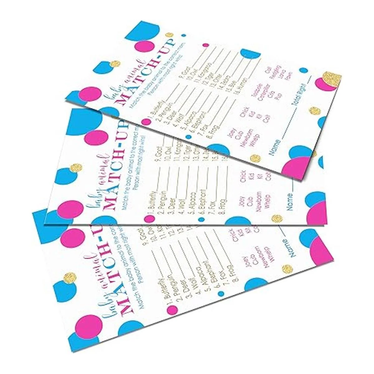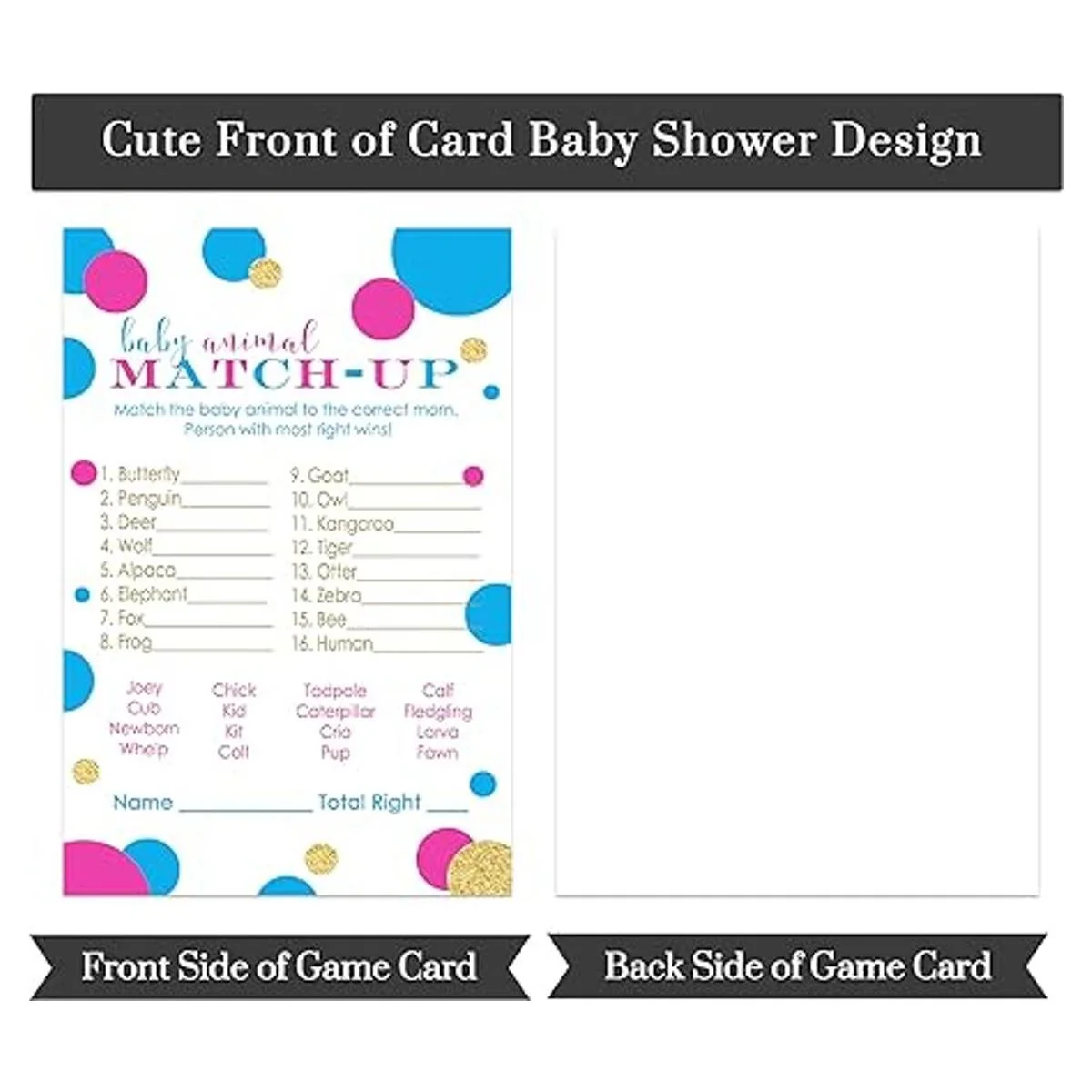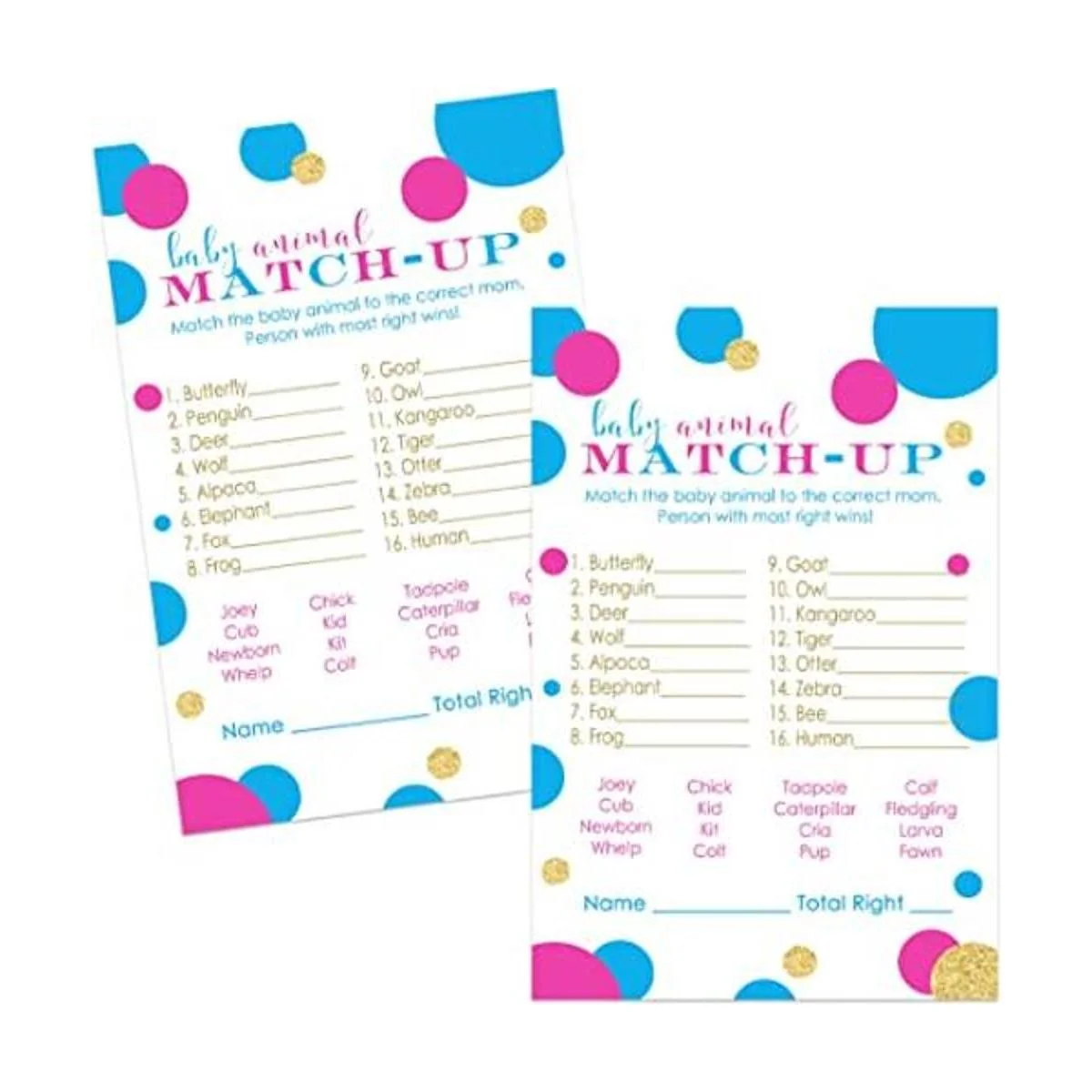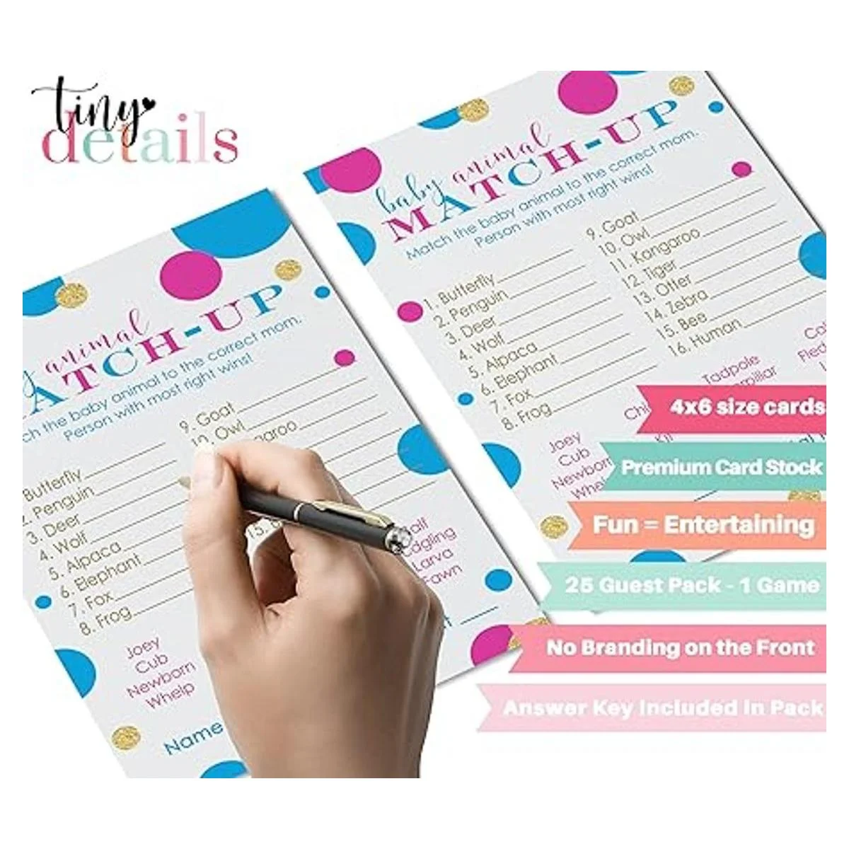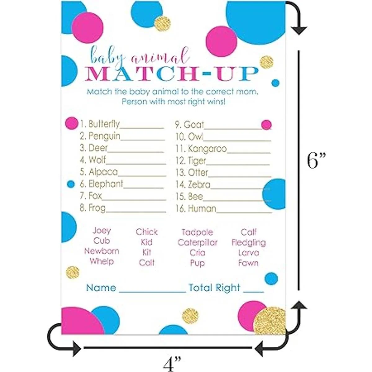 Deja que comience la diversión: tus invitados pasarán el mejor momento jugando este divertido juego de baby shower a juego. Nuestro juego de baby shower temático de revelación de género rosa o azul es una gran manera de mantener a cada persona entretenida durante el juego de baby shower. Comienza tu fiesta con el juego de partidos de animales para baby shower, espolvorear, revelación de género, fiesta de cumpleaños o cualquier evento especial.
