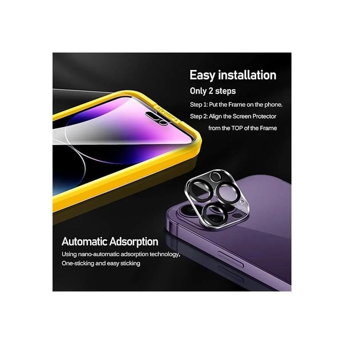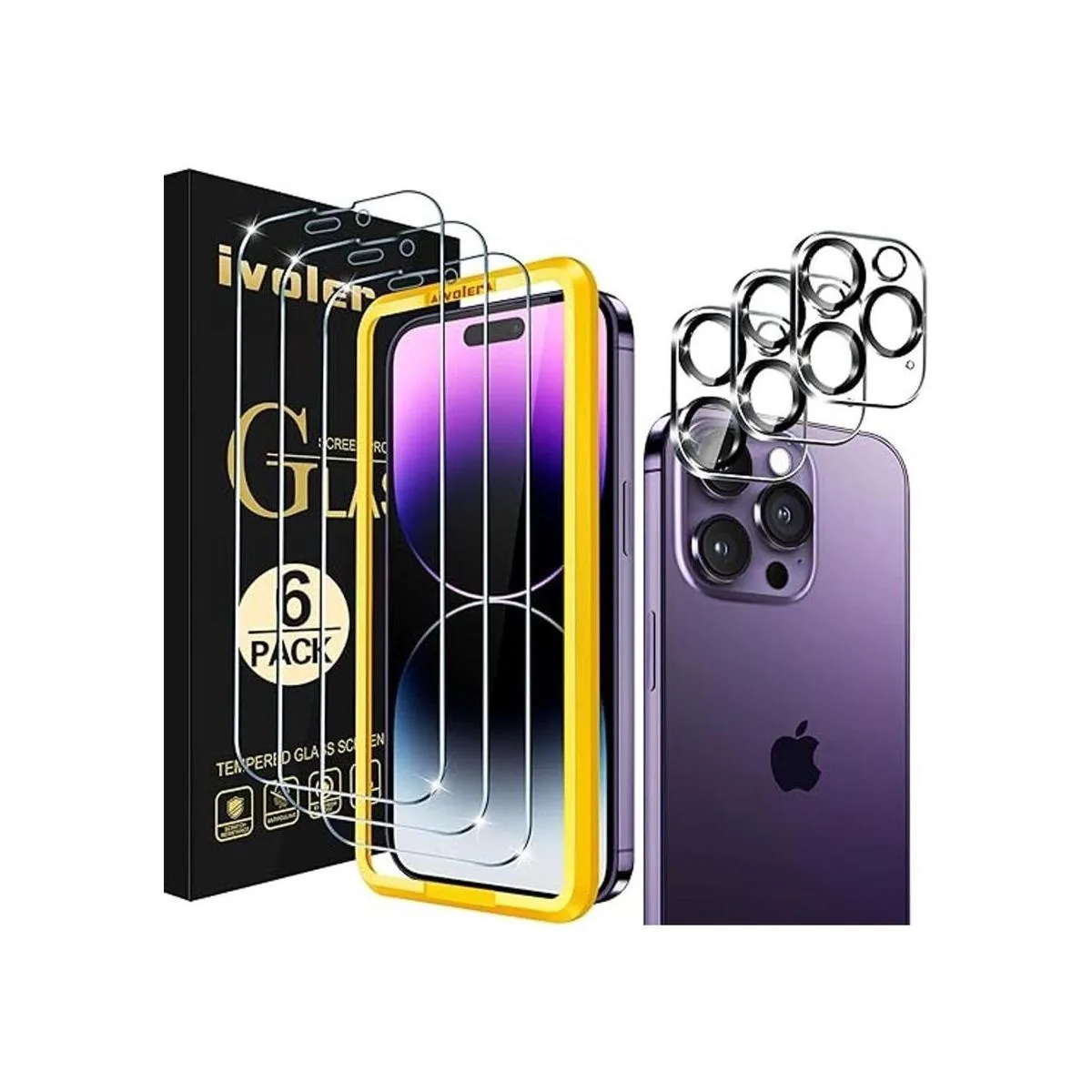 Paquete de 3 3 iVoler Protector de pantalla de vidrio templado para iPhone 14 Pro Max de 6.7 pulgadas paquete de 3 protectores de lente de cámara con marco de alineación, película transparente HD transparente antiarañazos
