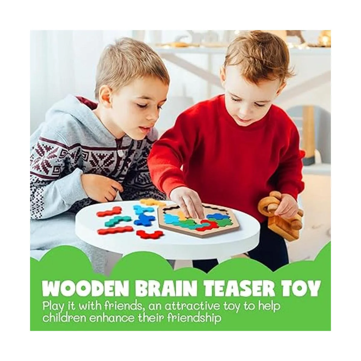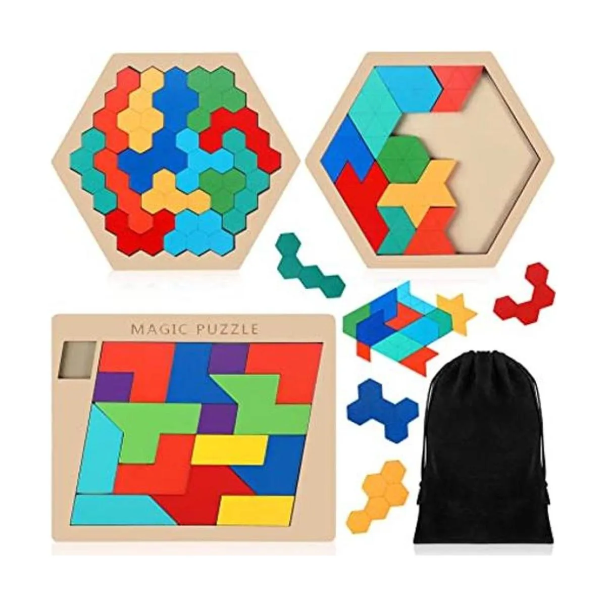 Paquete de 3 bloques de rompecabezas de madera hexagonal, rompecabezas geométrico, bloque de forma de rompecabezas cerebral, juguete ruso, bloques lógicos IQ STEM Montessori para todas las edades, niños y adultos fantasía