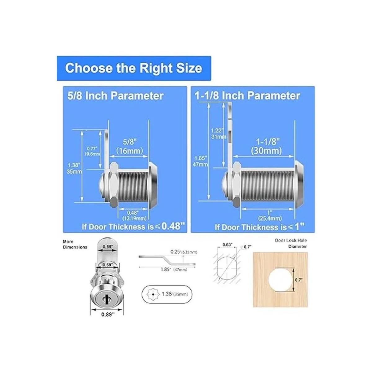 Tamaño del producto: diferentes longitudes de cerraduras de leva son adecuadas para diferentes grosores de paneles de puerta. Antes de comprar, comprueba la introducción de tallas en la figura 2 y elige el tamaño correcto Longitud del cuerpo de la cerradura de leva: 0.630 in, grosor de la puerta 0.480 in, diámetro del agujero de la cerradura: 0.709 in, dos placas de diferentes formas de 1.835 in y 1.378 in. Las cerraduras de gabinete con llaves son ampliamente utilizadas en buzón, caja de herramientas, archivadores, puertas de caravanas y caravanas.