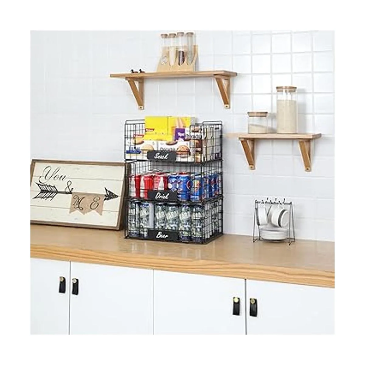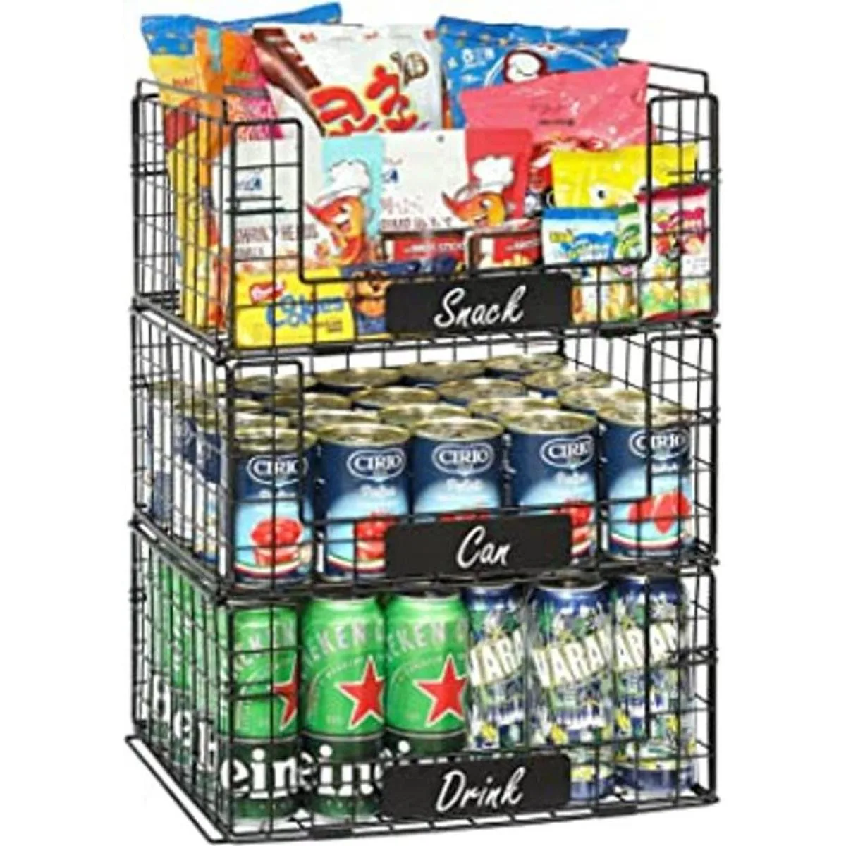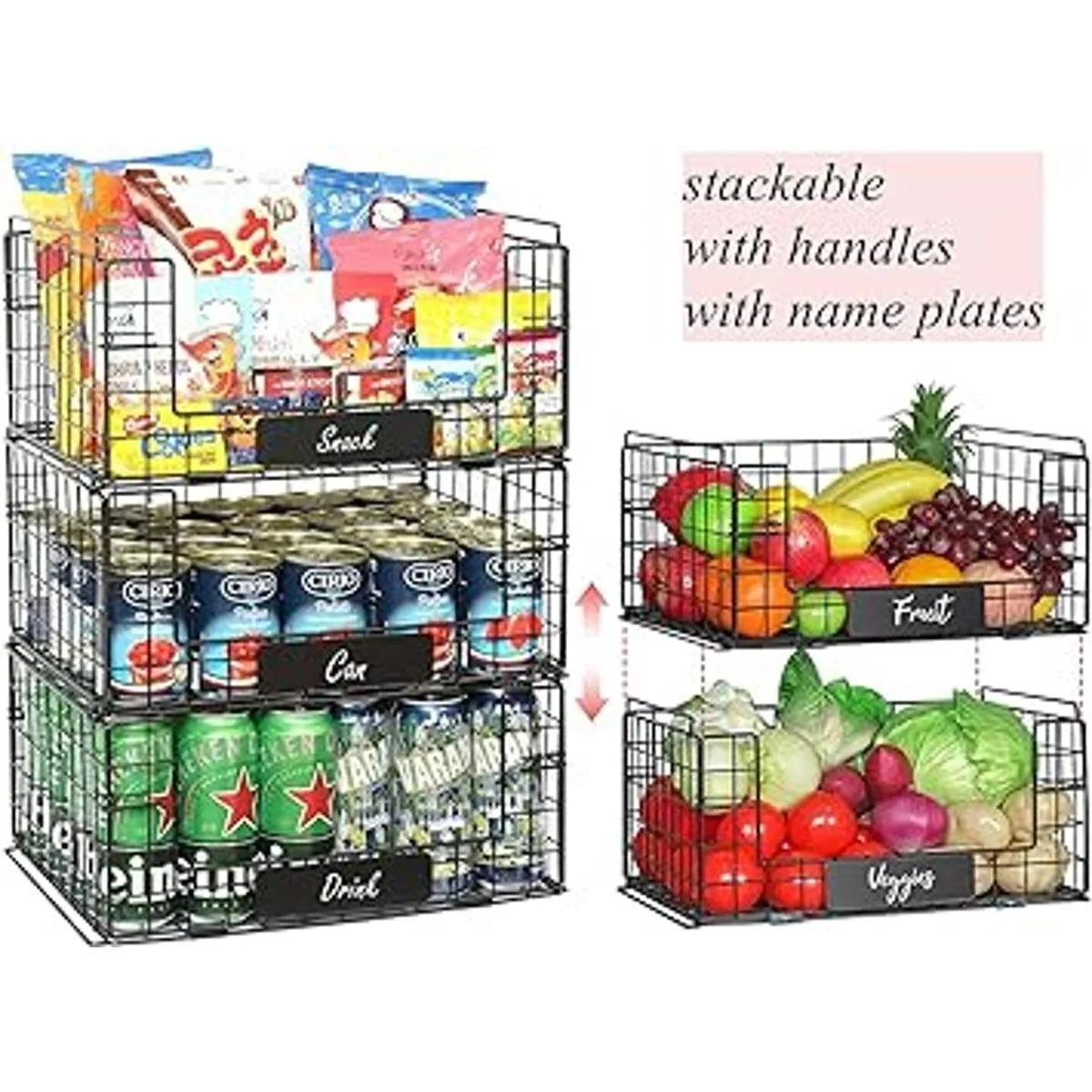 Paquete de 3 cestas apilables de alambre con asas para almacenamiento y organización de despensa, cesta de frutas y verduras con placas de nombre, contenedores de almacenamiento de metal para latas de aperitivos, frutas y verduras