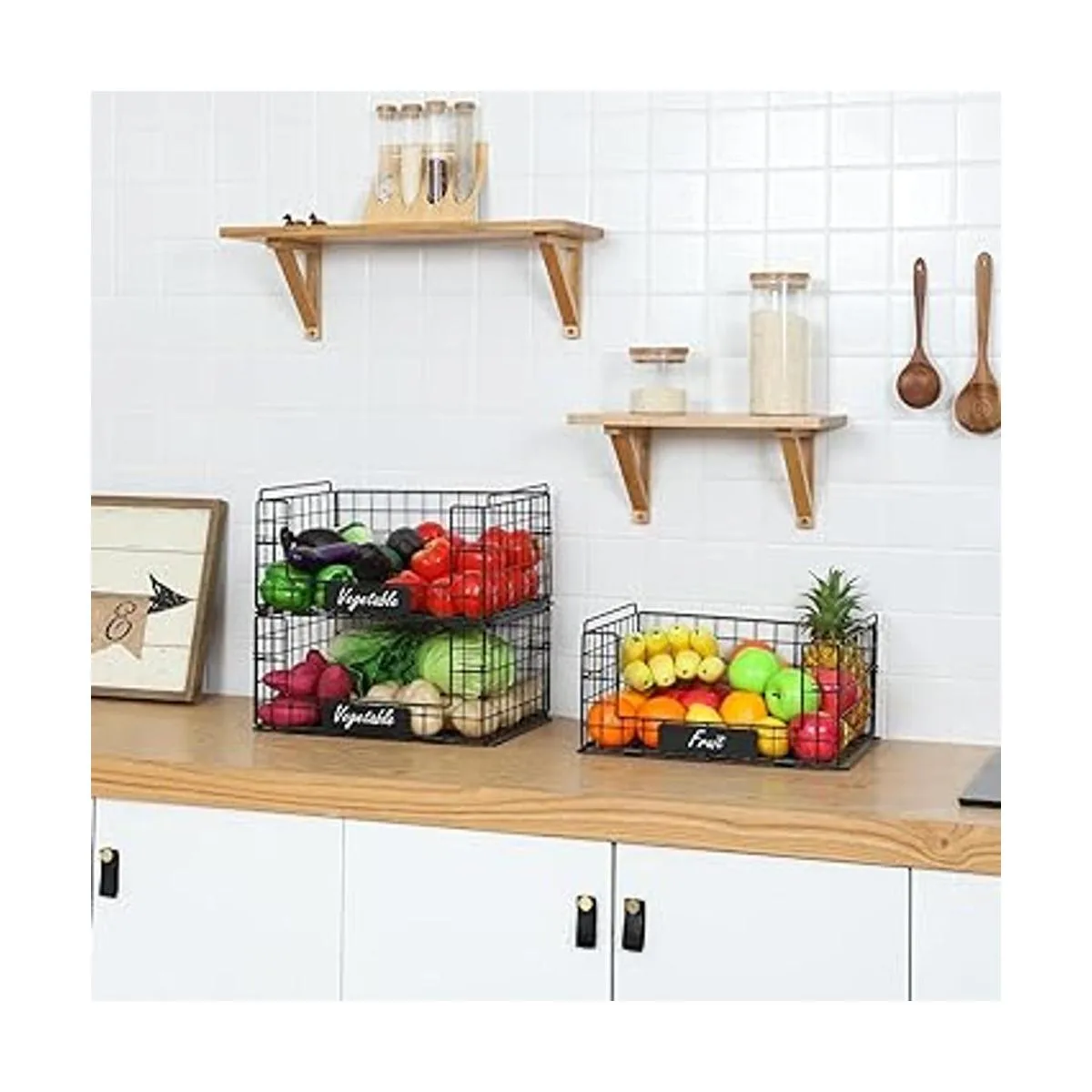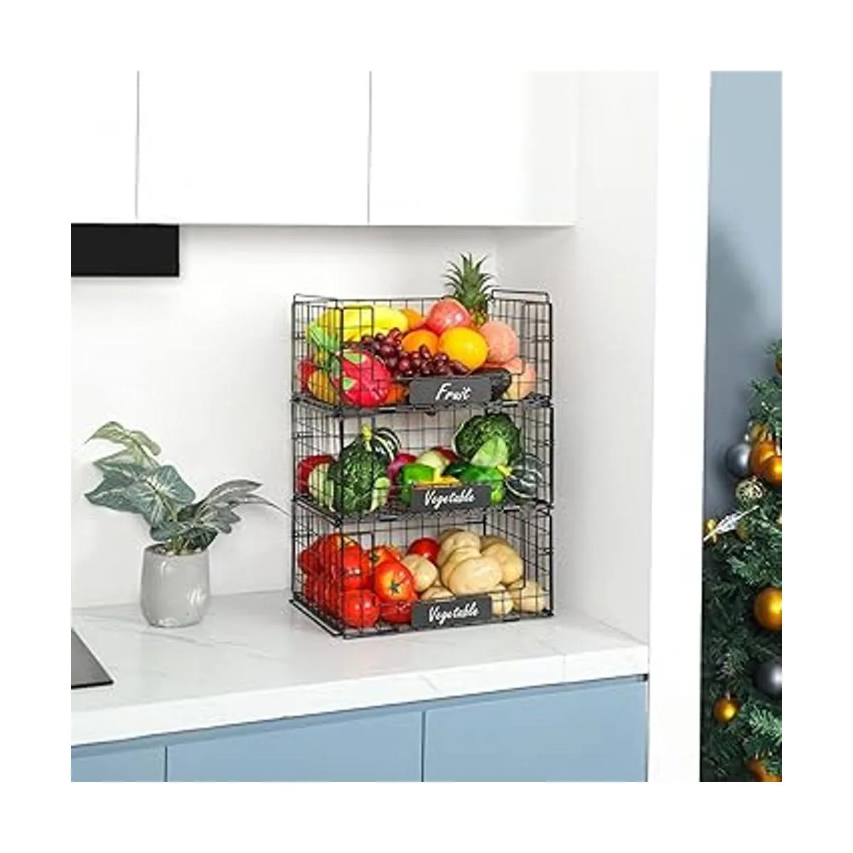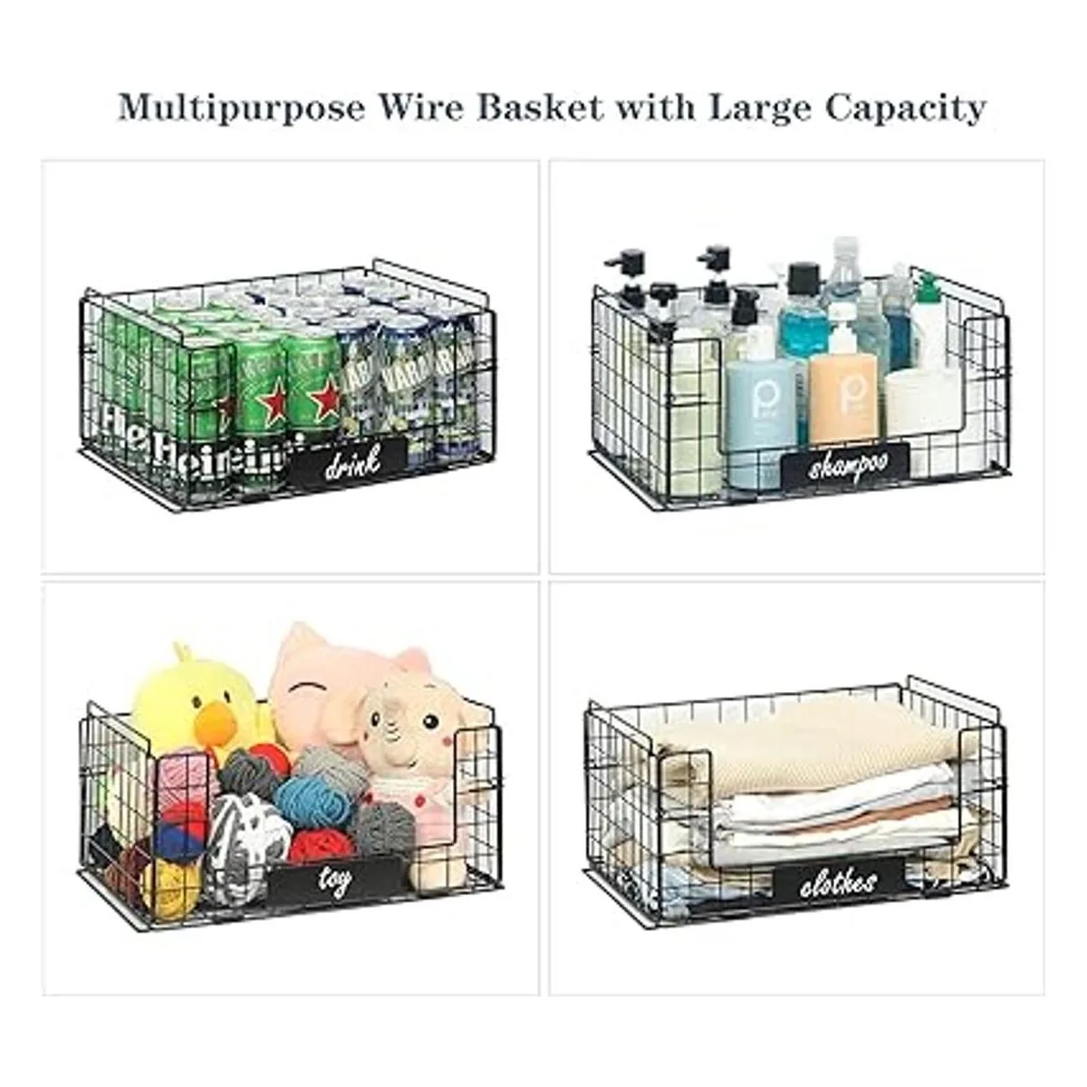 Paquete de 3 cestas apilables de alambre con asas para almacenamiento y organización de despensa, cesta de frutas y verduras con placas de nombre, contenedores de almacenamiento de metal para latas de aperitivos, frutas y verduras