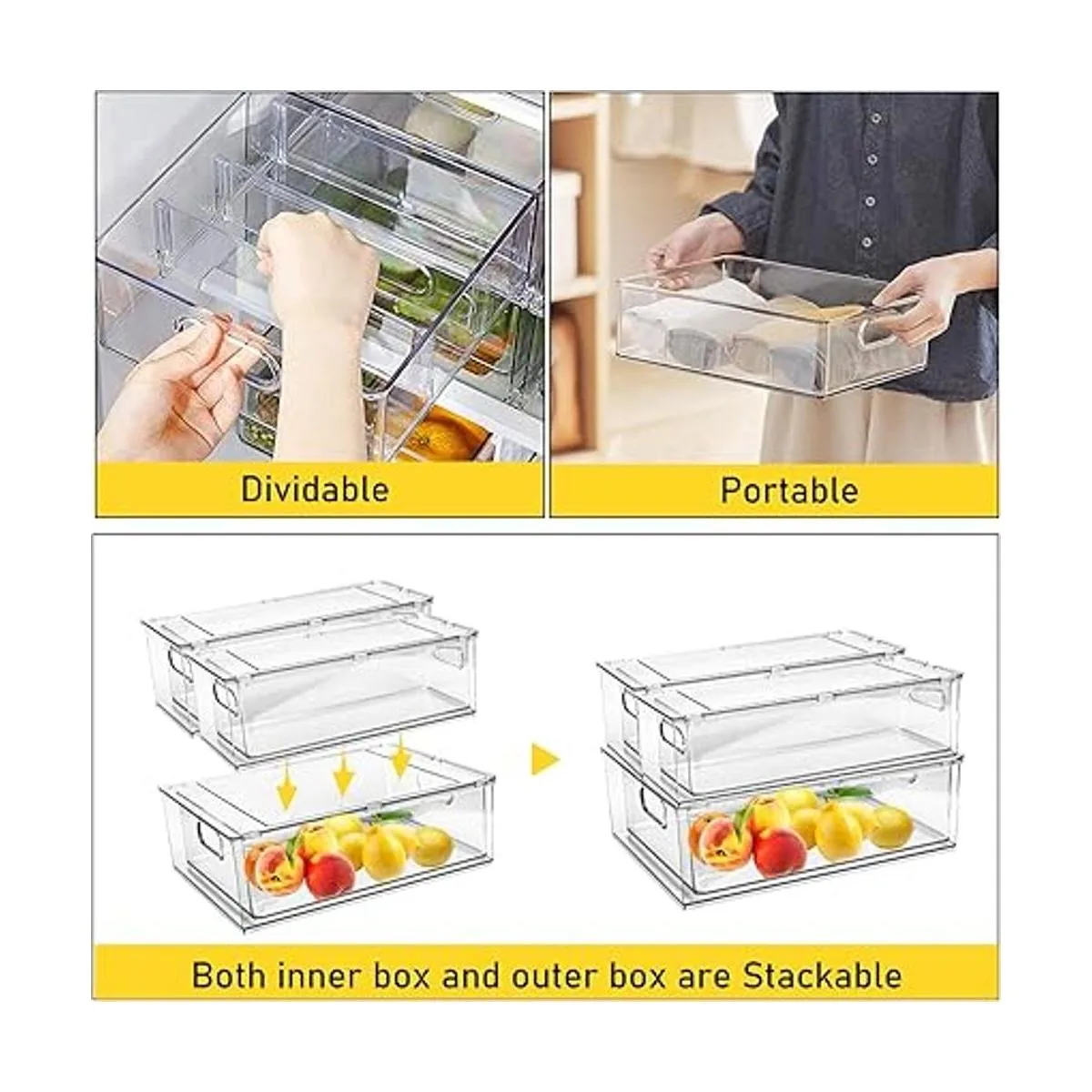 Diseño de cajón: nuestro cajón de refrigerador es diferente del organizador de refrigerador ordinario. Es un juego completo de cajones, tira del mango para abrir y cerrar fácilmente, que aísla el contenido interior y los mantiene frescos. Los cajones grandes también están equipados con particiones extraíbles, por lo que puedes planificar libremente el espacio y ordenarlo para almacenamiento.