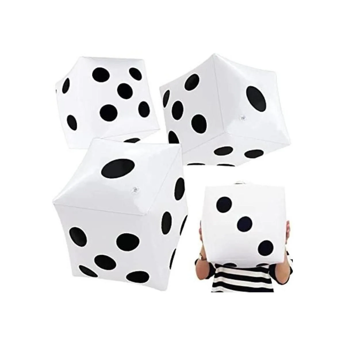 El paquete incluye: 3 unidades en un juego, la longitud de estos dados inflables de gran tamaño es de 13.7 pulgadas inflado, puntos negros sobre fondo blanco.