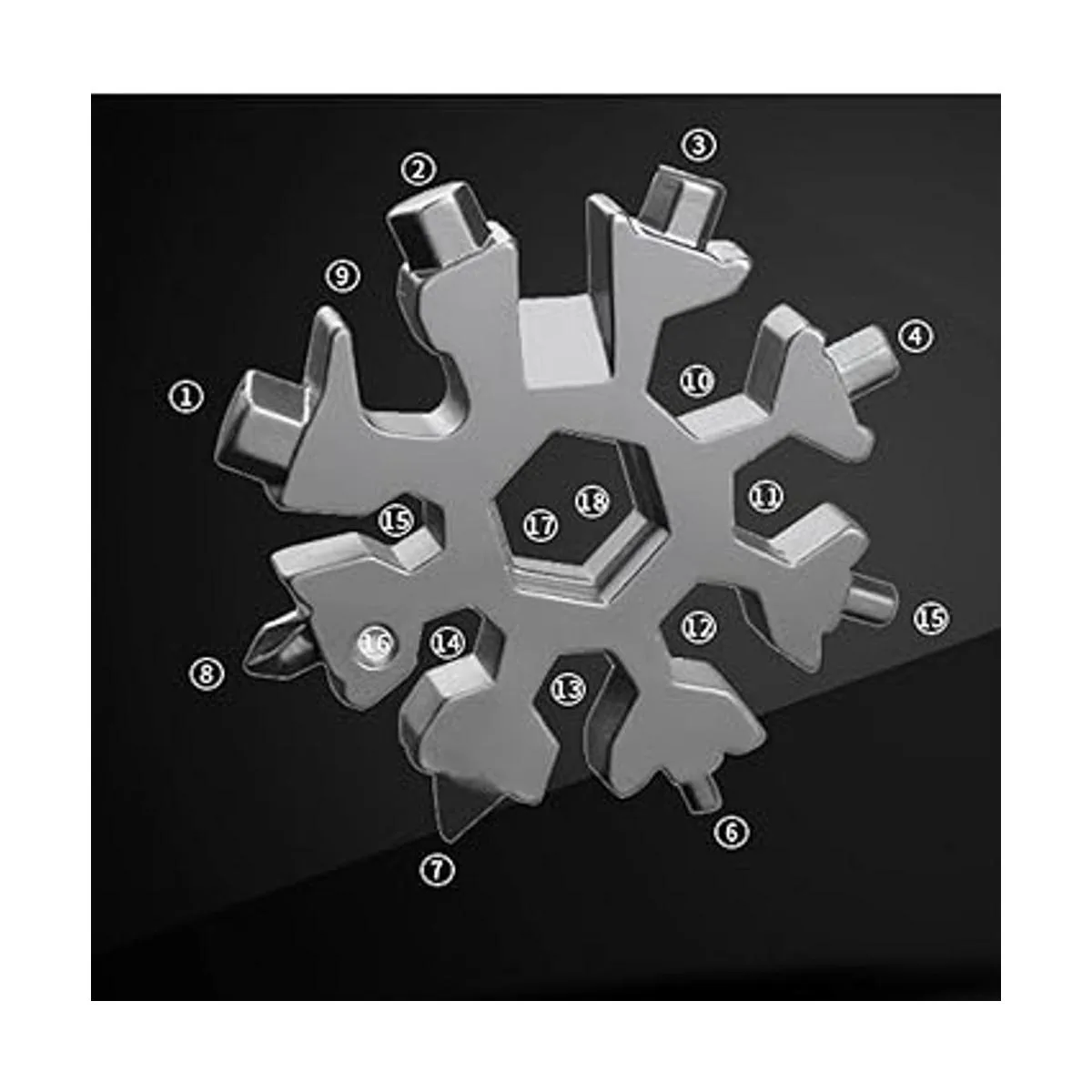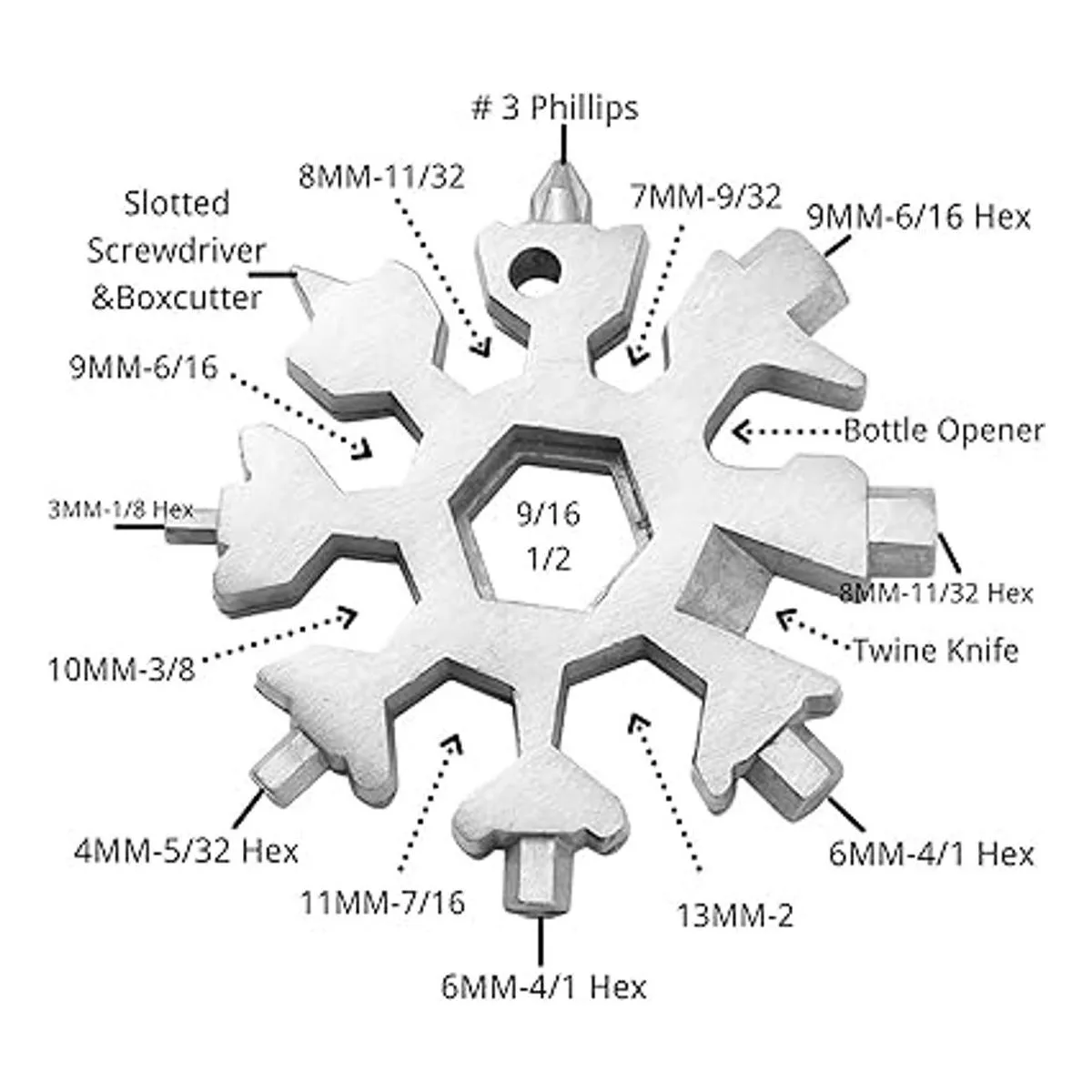 Multiherramienta de copo de nieve 18 en 1 Destornillador ranurado y abrebotellas, destornillador Phillips: métrico milímetros 3; SAE pulgadas 1/8, llave Allen: métrica milímetros 345689; SAE pulgadas 1/85/323/161/411/326/326/6/326/6/6/6/326/6/6/6/16, hexagonal exterior Llave: métrico milímetros 789101113; SAE pulgadas 9/3211/326/163/87/161/2