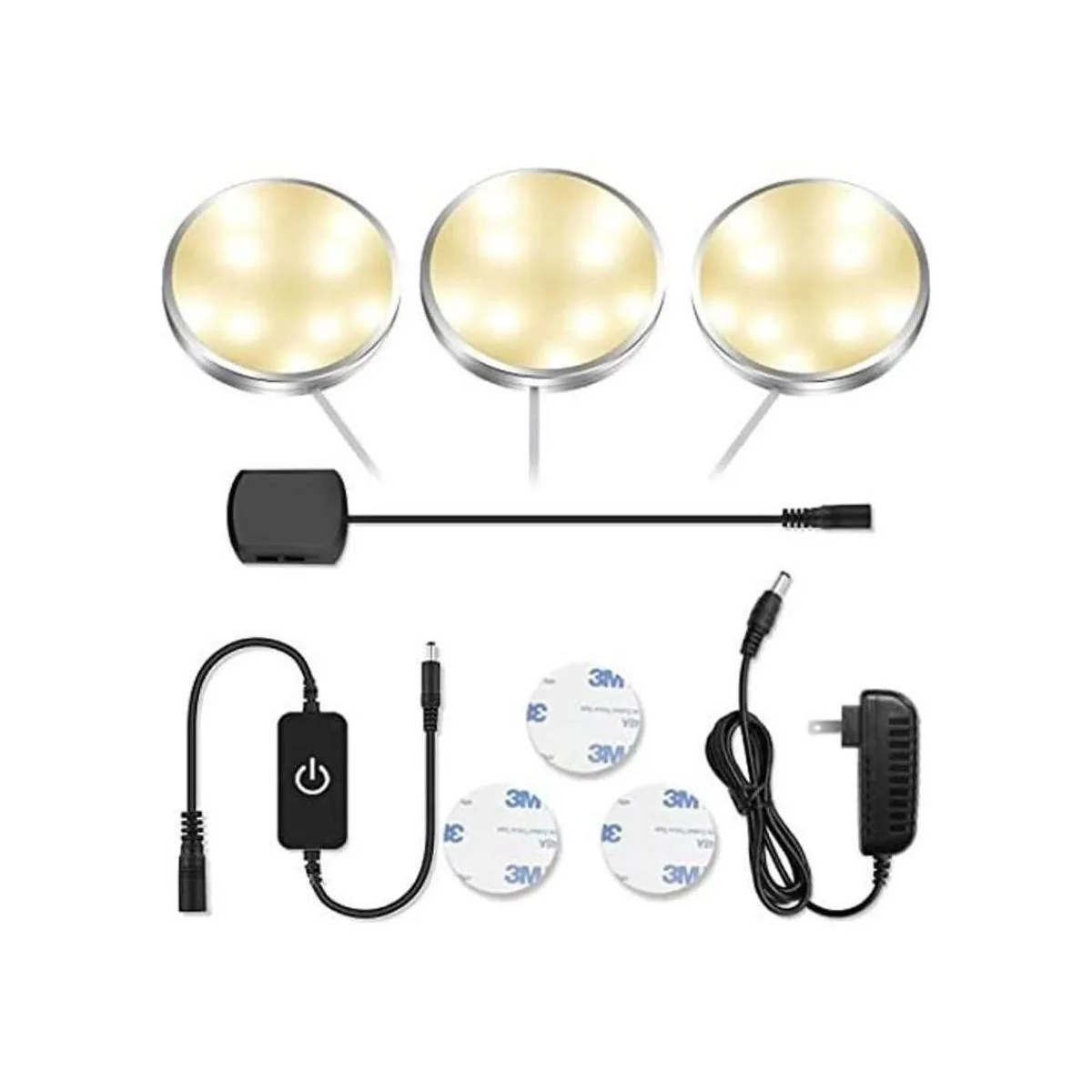 Paquete de 3 luces LED de disco, iluminación debajo del gabinete, borde plateado, 3000 K, blanco cálido, CRI90, atenuación táctil, todos los accesorios incluidos, iluminación debajo del mostrador para cocina, luces de armario, luz segura