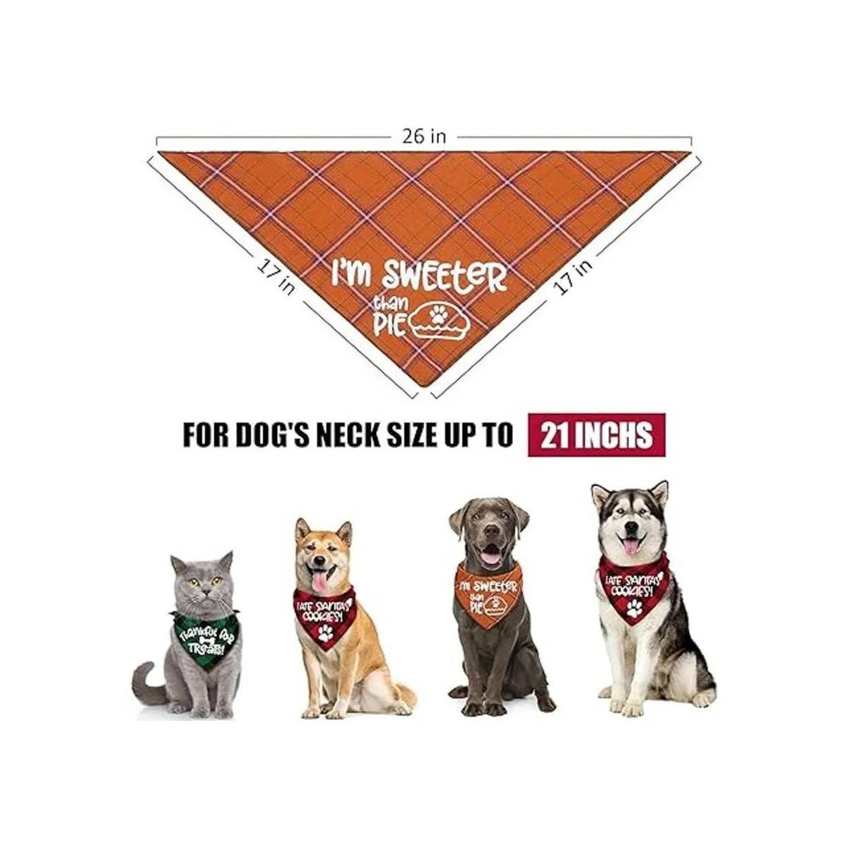 Para cuello de perro de hasta 21 pulgadas: las bandanas de Navidad para perro vienen como una bandana triangular de 26 x 17 pulgadas base x hipotenusa, que se puede plegar varias veces y también puede evitar que el pecho de tu perro sufra todo tipo de alimentos, baba y suciedad. Bufanda de perro para cuello de perro de hasta 21 pulgadas y mide el tamaño de tu lindo y deja espacio para atar nudos. Estas bandanas para perros son ideales para perros de tamaño pequeño a mediano como pomerania, lucha francesa, lucha británica, corgi, husky, perro de montaña, etc.