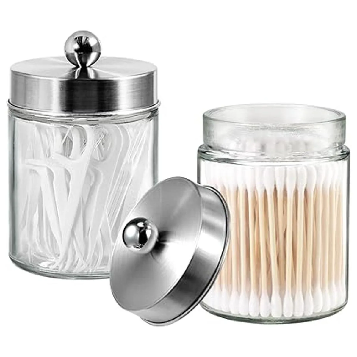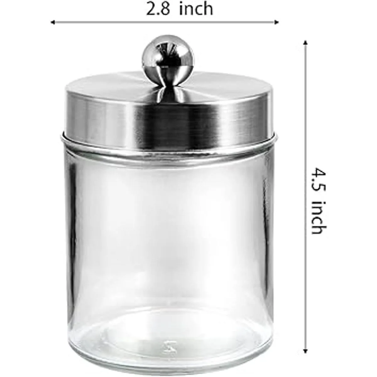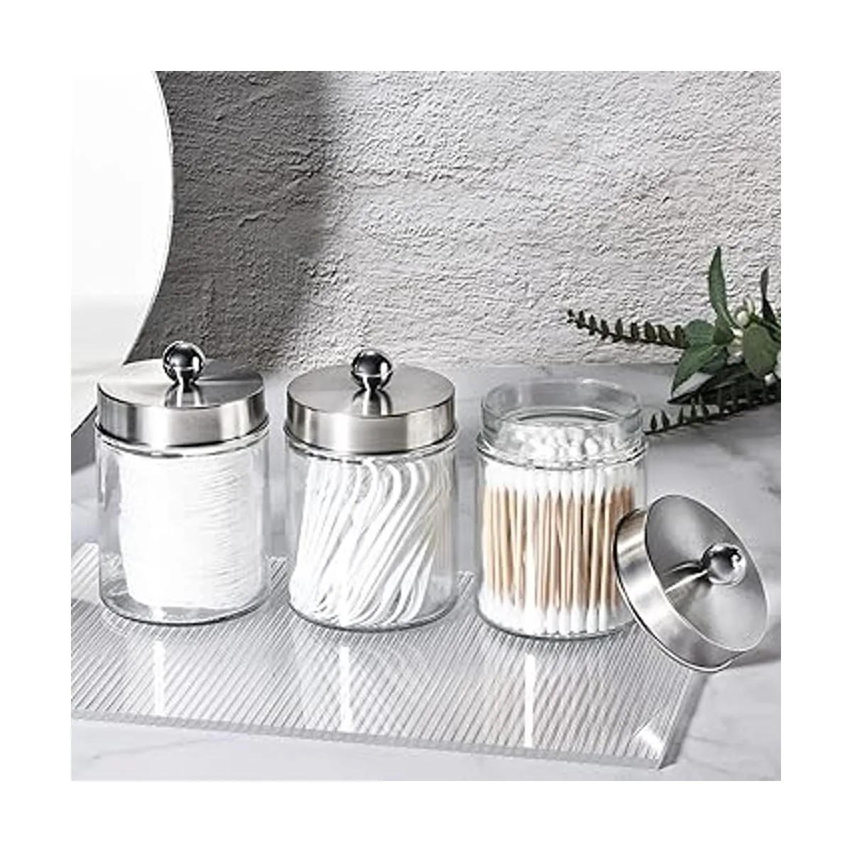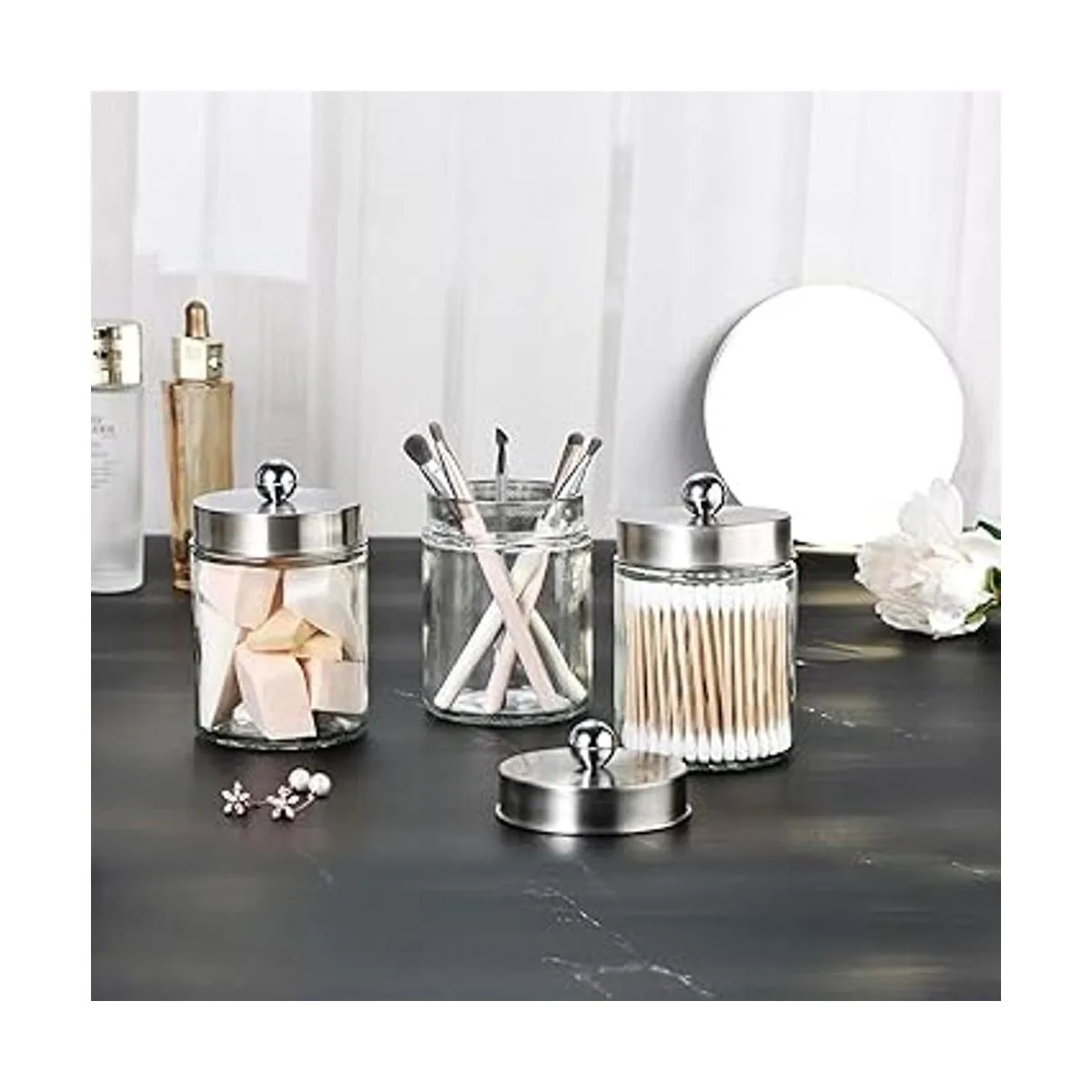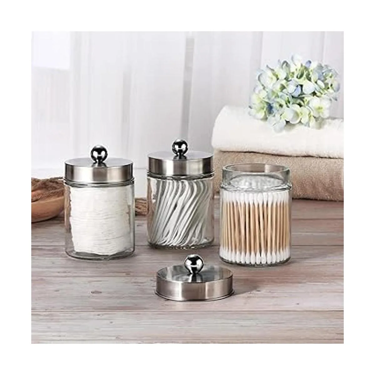 Paquete de 3 recipientes de boticario organizador de tocador de baño, juego de organizador de almacenamiento Qtip con tapas de acero inoxidable y bonitas calcomanías para Qtips, hisopos de algodón, esponjas de maquillaje, hilo dental níquel cepillado