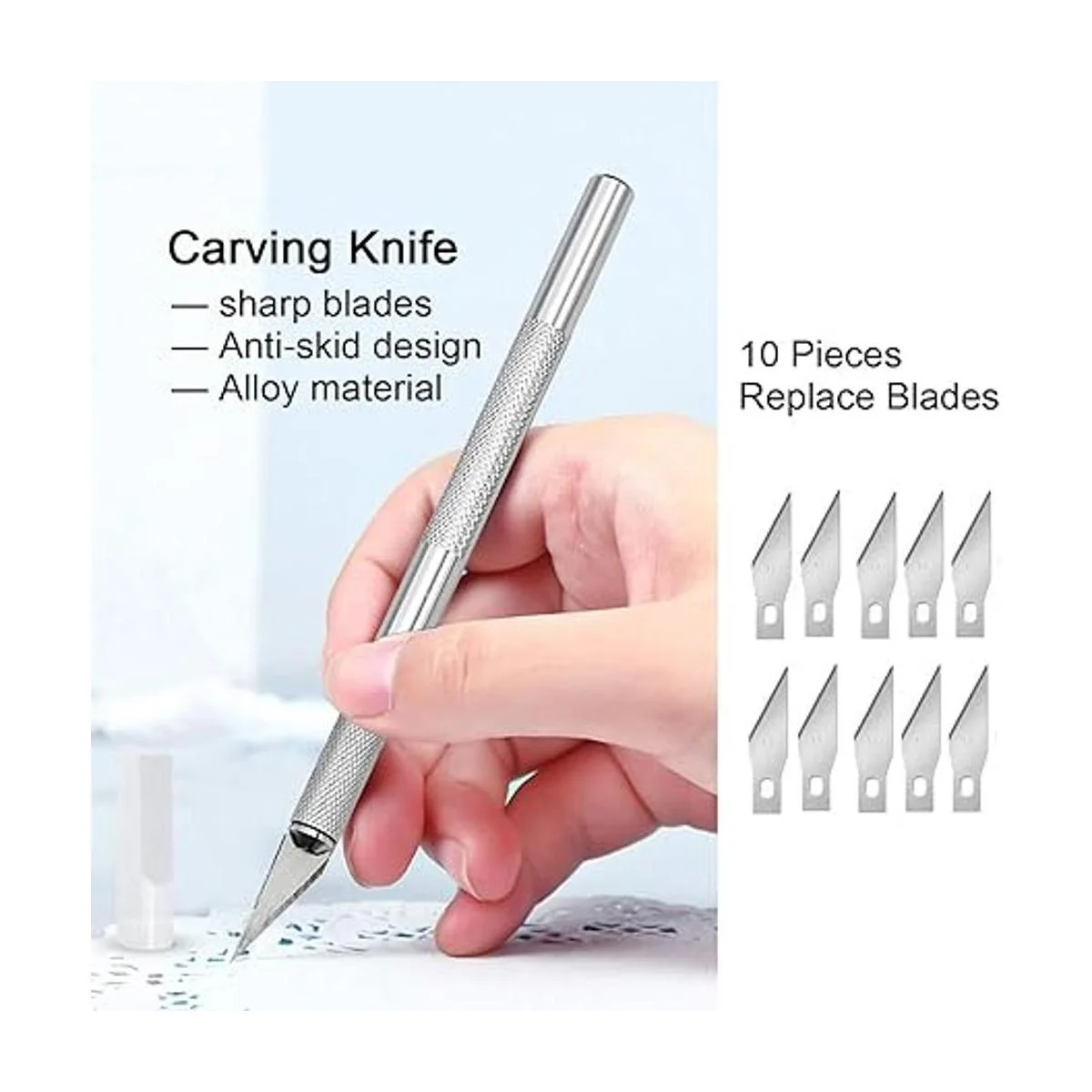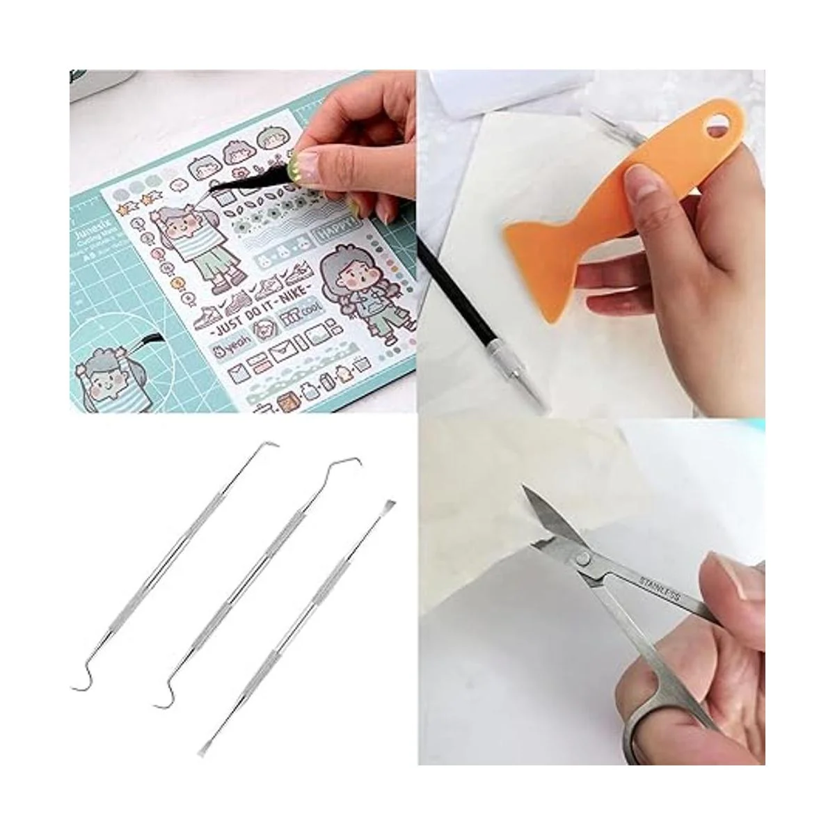 Juego de herramientas valiosas: 1 tijeras, 1 regla de acero inoxidable, 2 pinzas, 4 raspadores, 1 bolígrafo raspador, 3 ganchos o púas, 10 cuchillas de cuchillo, 1 cuchillo de pasatiempo, 4 reglas de alineación de camisetas, 1 bolígrafo de trazado, 1 punzón, 2 espátulas, 1 alfombrilla de corte A4.