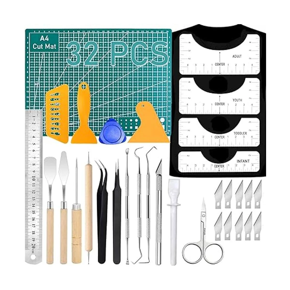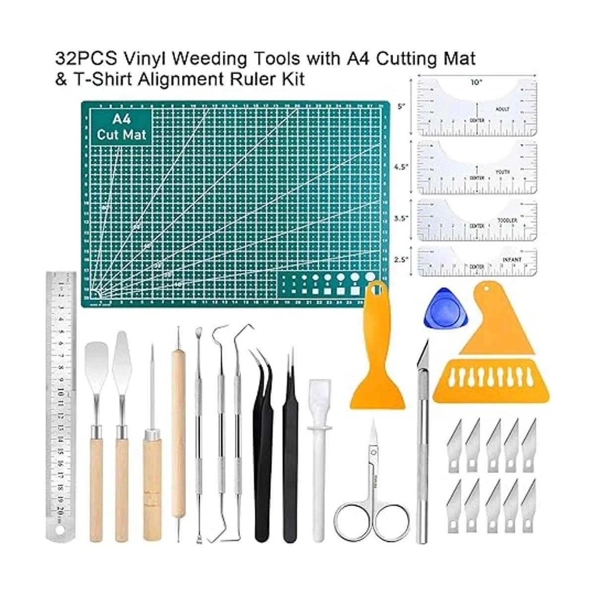 Paquete de 32 herramientas de deshierbe de vinilo con kit de regla de alineación de camiseta, herramientas de desmalezado para vinilo, kit de herramientas de desmalezado de vinilo para desmalezar vinilo, regalos de Navidad, manualidades, siluetas, cameos, corte, álbum de recortes