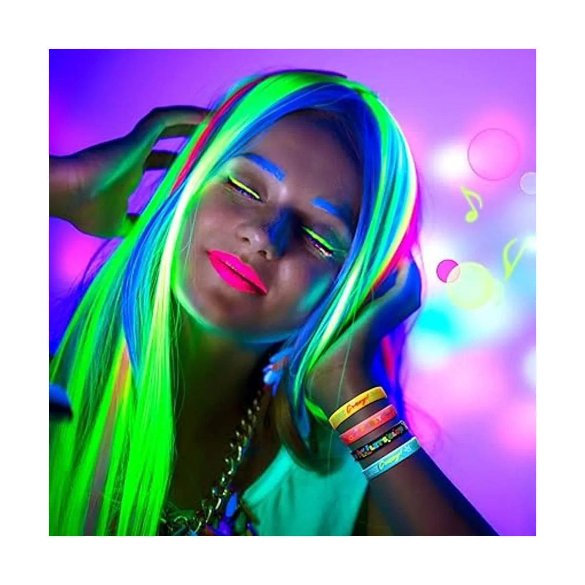 Materiales de calidad: la pulsera de neón está hecha de materiales de silicona de calidad, suave, seguro, cómodo de llevar, elástico y tiene un efecto luminoso; solo tienes que exponer estas pulseras a la luz durante un período de tiempo, entonces puedes ver el efecto luminoso en la oscuridad