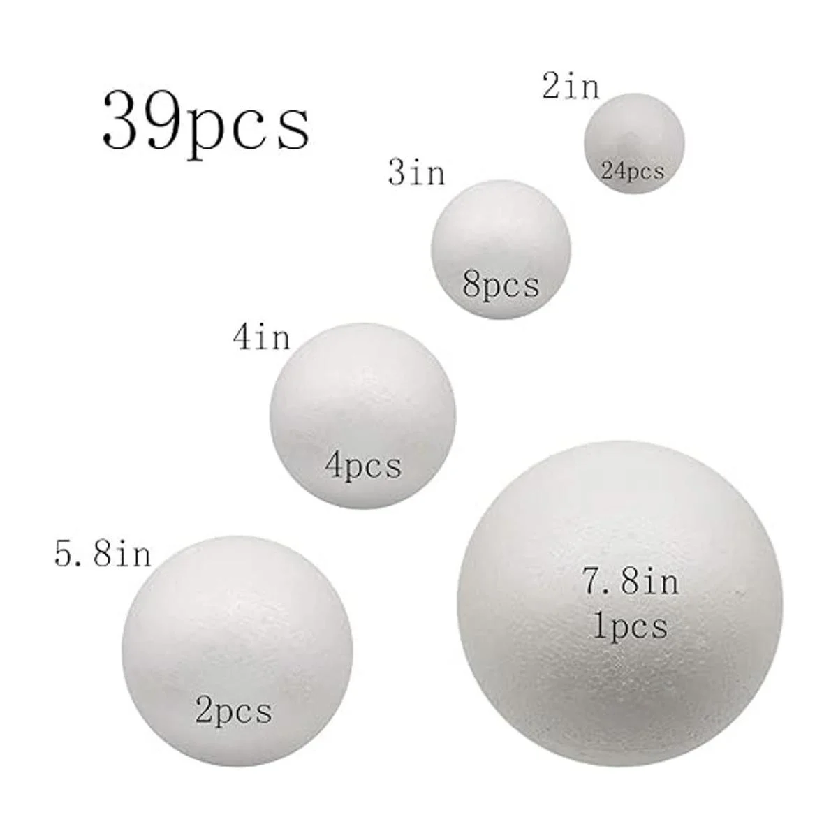 Paquete de 39 bolas de espuma para manualidades, 5 tamaños incluyendo 2 7.8 pulgadas, bolas redondas de poliestireno, bolas de espuma para artes y manualidades, bodas, manualidades para el hogar, suministros escolares y fiestas navideñas, color blanco