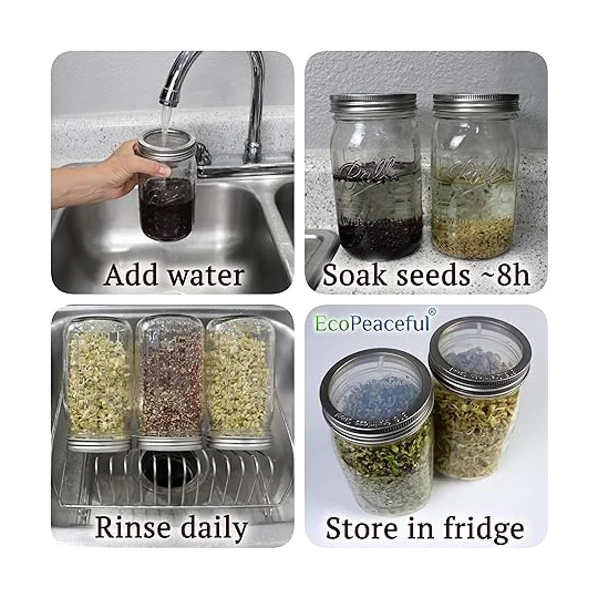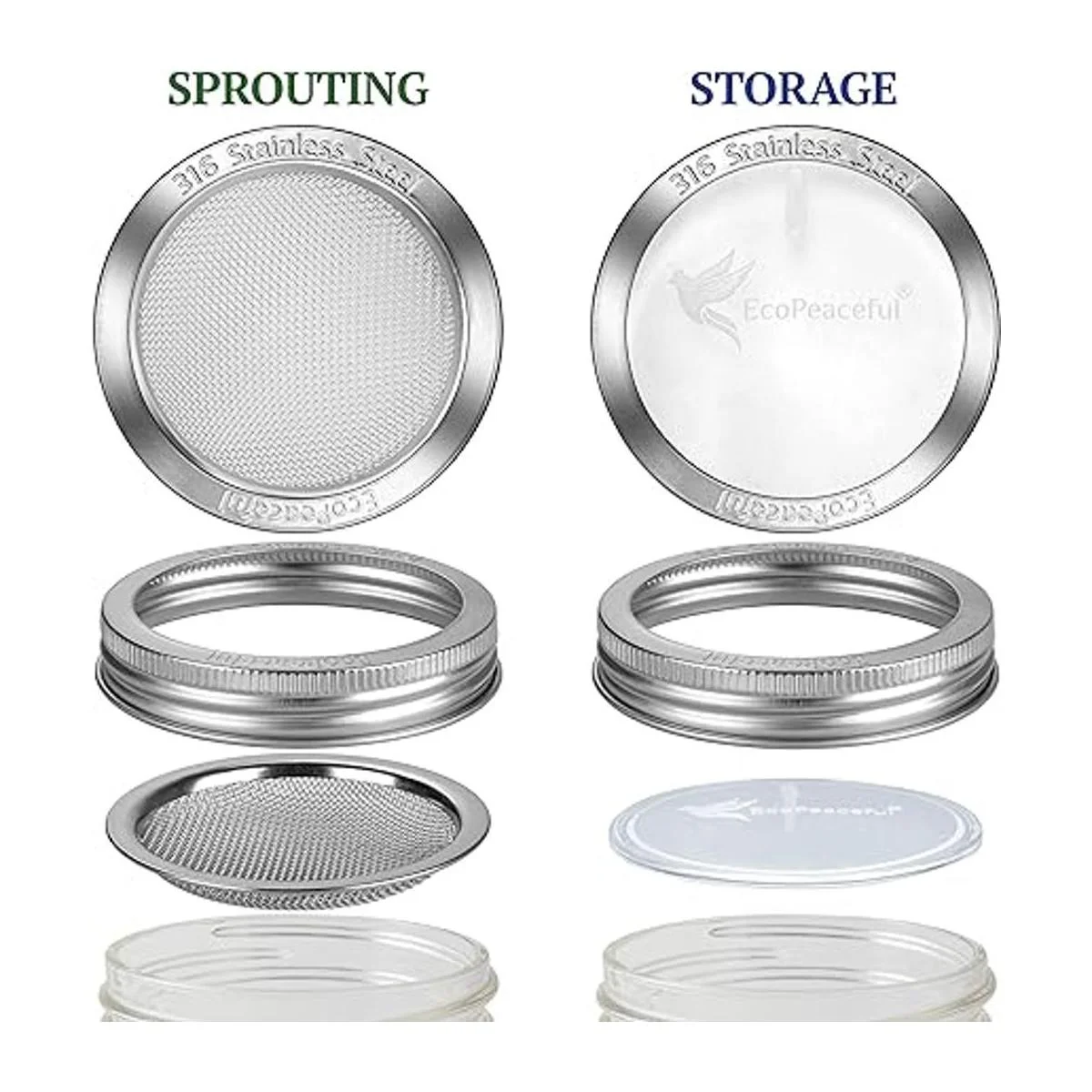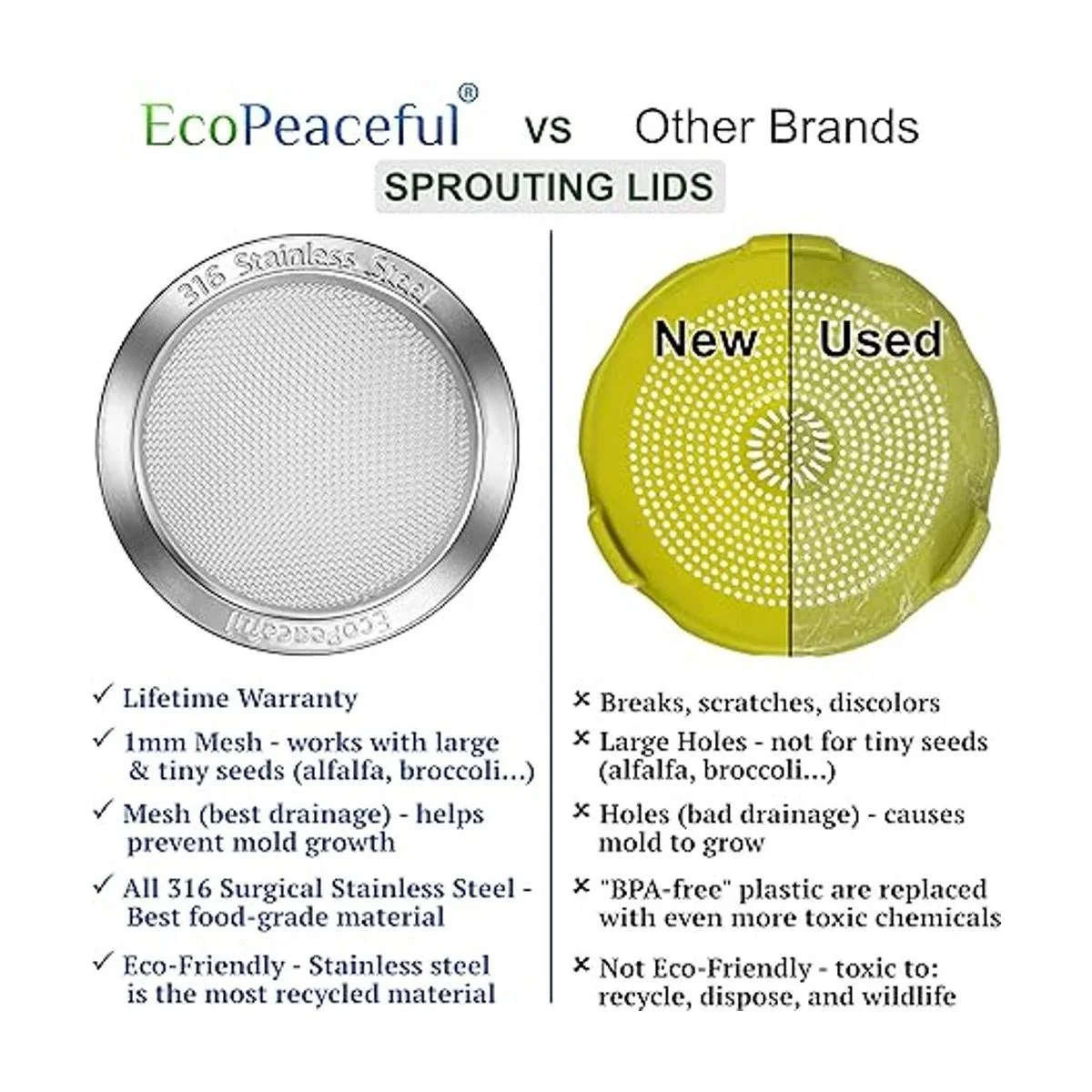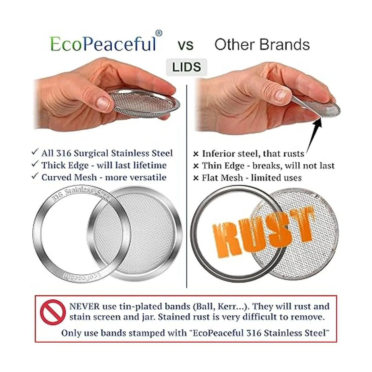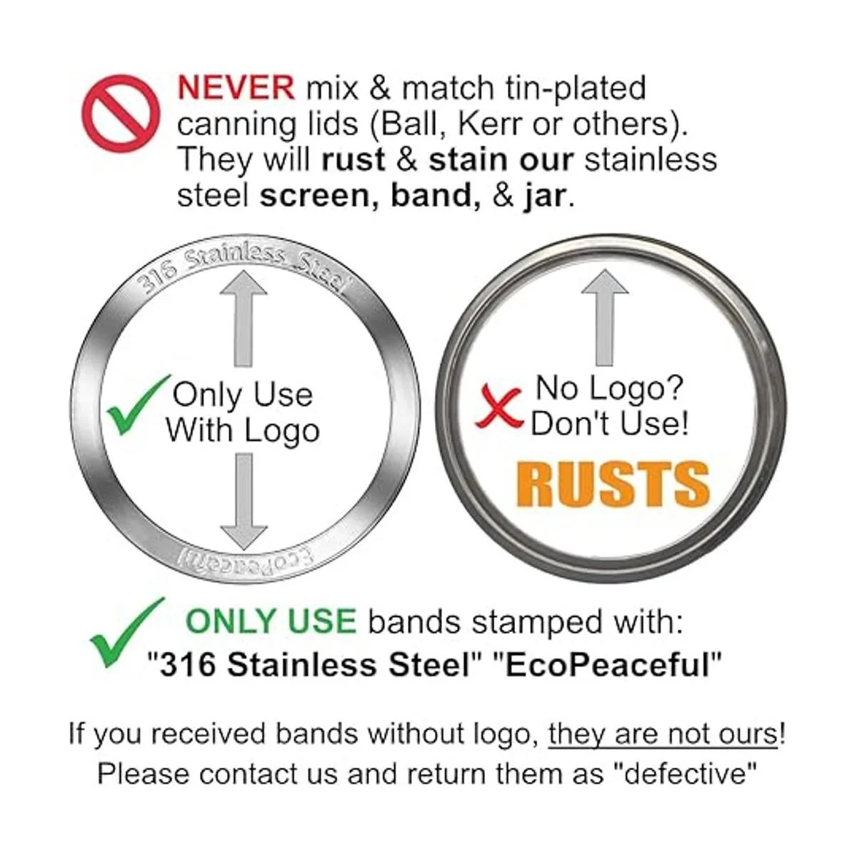 Nunca utilices anillos chapados en estaño bola, Kerr, y otros para brotar. Solo utiliza anillos con el sello EcoPeaceful 316 Stainless Steel. Los anillos de lata se oxidan y dejan manchas de óxido en todas partes. Imágenes de clientes que muestran el anillo, la pantalla y el tarro oxidados, no es nuestro anillo, nuestros anillos tienen el sello EcoPeaceful 316 Stainless Steel, claramente visible en ambos lados. Si recibes anillos sin el logotipo EcoPeaceful 316 Stainless Steel, devuélvelos como defectuososos o ponte en contacto con nosotros para investigación.