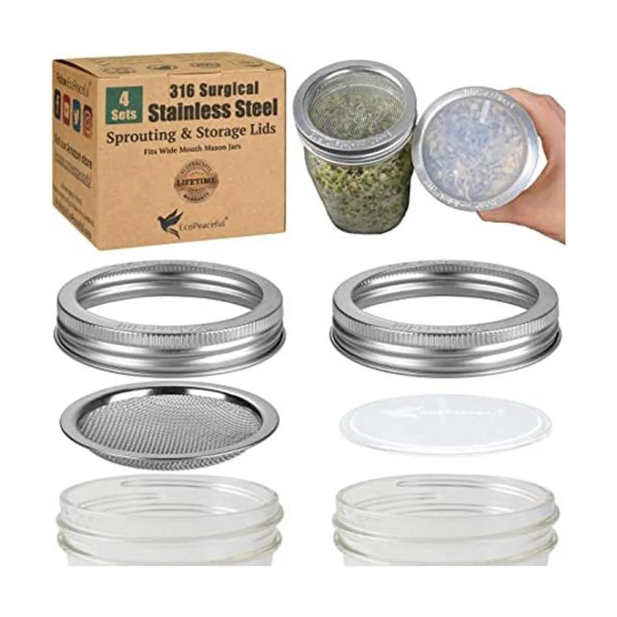 Paquete de 4 (4 anillos, 4 pantallas, 4 insertos) tapas de brote de tarro Mason – 316 tapas de brote de acero inoxidable quirúrgico para tarros Mason de boca ancha, tapas de colador curvadas, insertos de silicona, a prueba de óxido, sin BPA