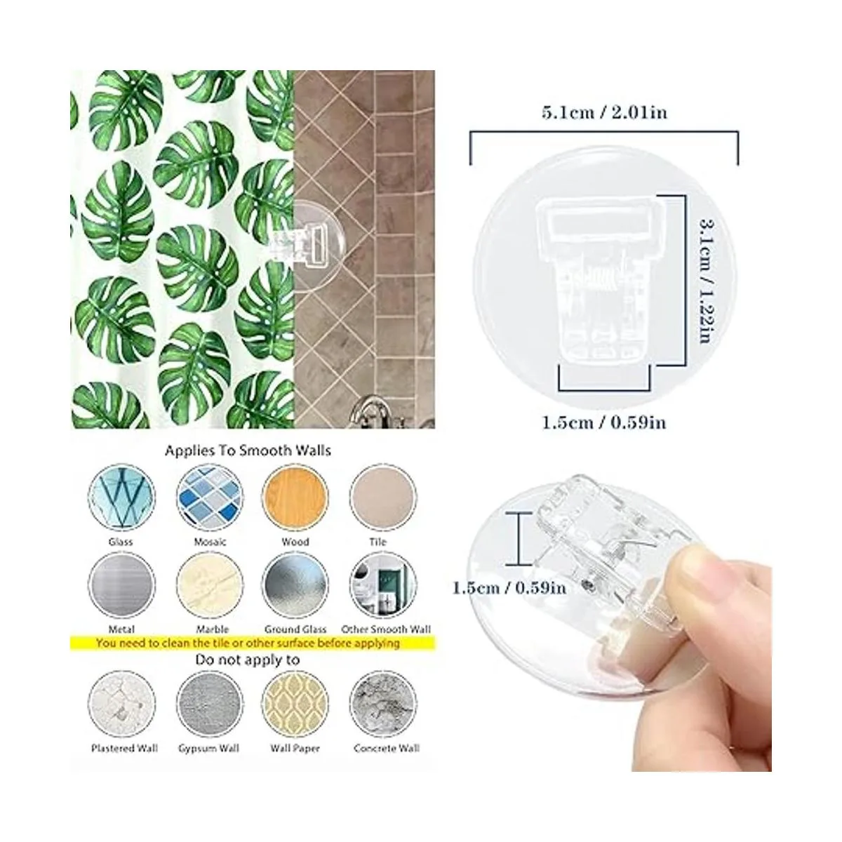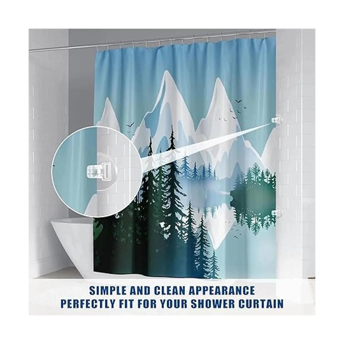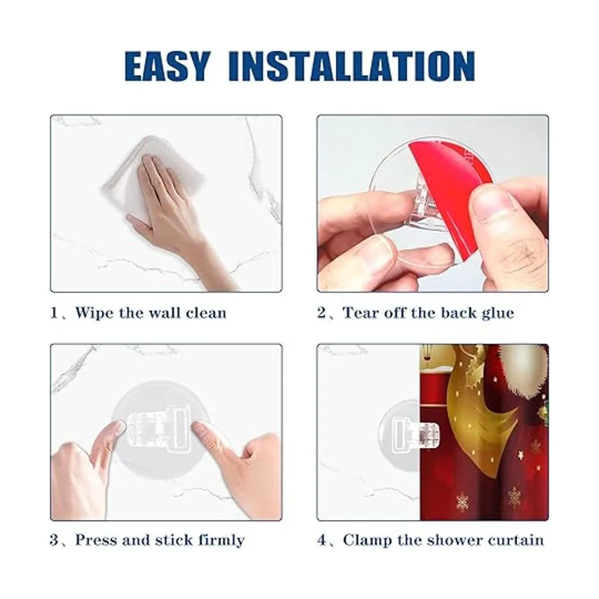 Material duradero: los clips para cortina de ducha están hechos de plástico de calidad, ligeros y duraderos, con estructura resistente y no se rompen fácilmente, y el diseño autoadhesivo hace que sea fácil de instalar en la pared, proporcionando una manera sencilla de fijar tus cortinas de ducha