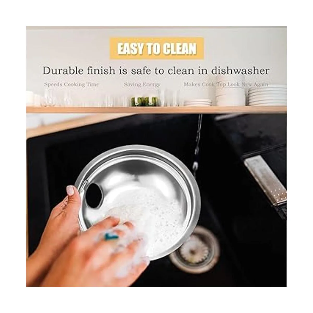Acabado duradero seguro para limpiar en lavavajillas, acelera el tiempo de cocción y ahorra energía. Hace que la parte superior de la cocina se vea nueva de nuevo