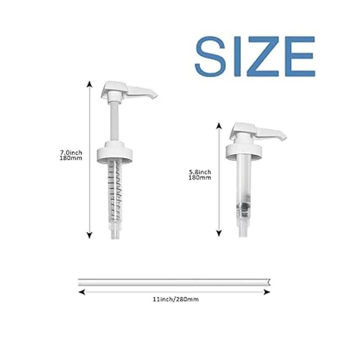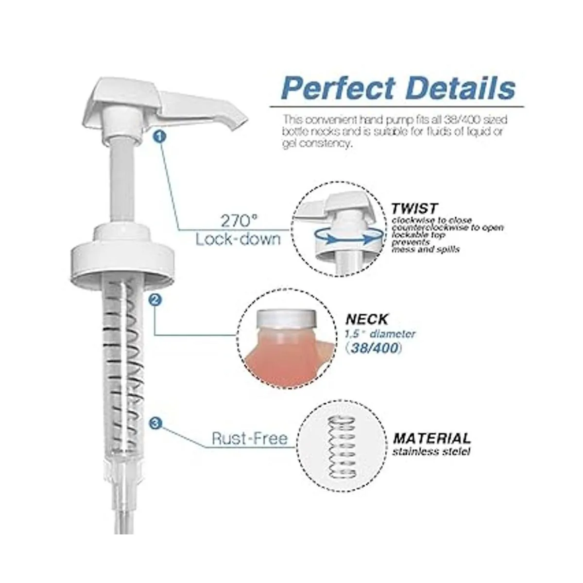 Tamaño estándar El dispensador 38/400 se adapta a la mayoría de botellas de 1 galón y 1/2 galón. Viene con tubos de 11.024 in, fácil de cortar para que coincida con tus botellas. 7 cc de líquido por prensa con rápida retracción y bloqueo superior ayuda a reducir el desperdicio de producto y hacer que tu producto dure más tiempo.