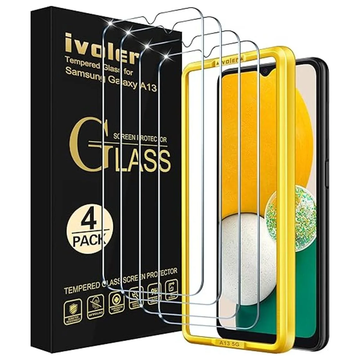 Paquete de 4 iVoler Protector de pantalla de vidrio templado para Samsung Galaxy A13 5G 6.5 pulgadas con marco de fácil instalación dureza 9H, antiarañazos, sin burbujas