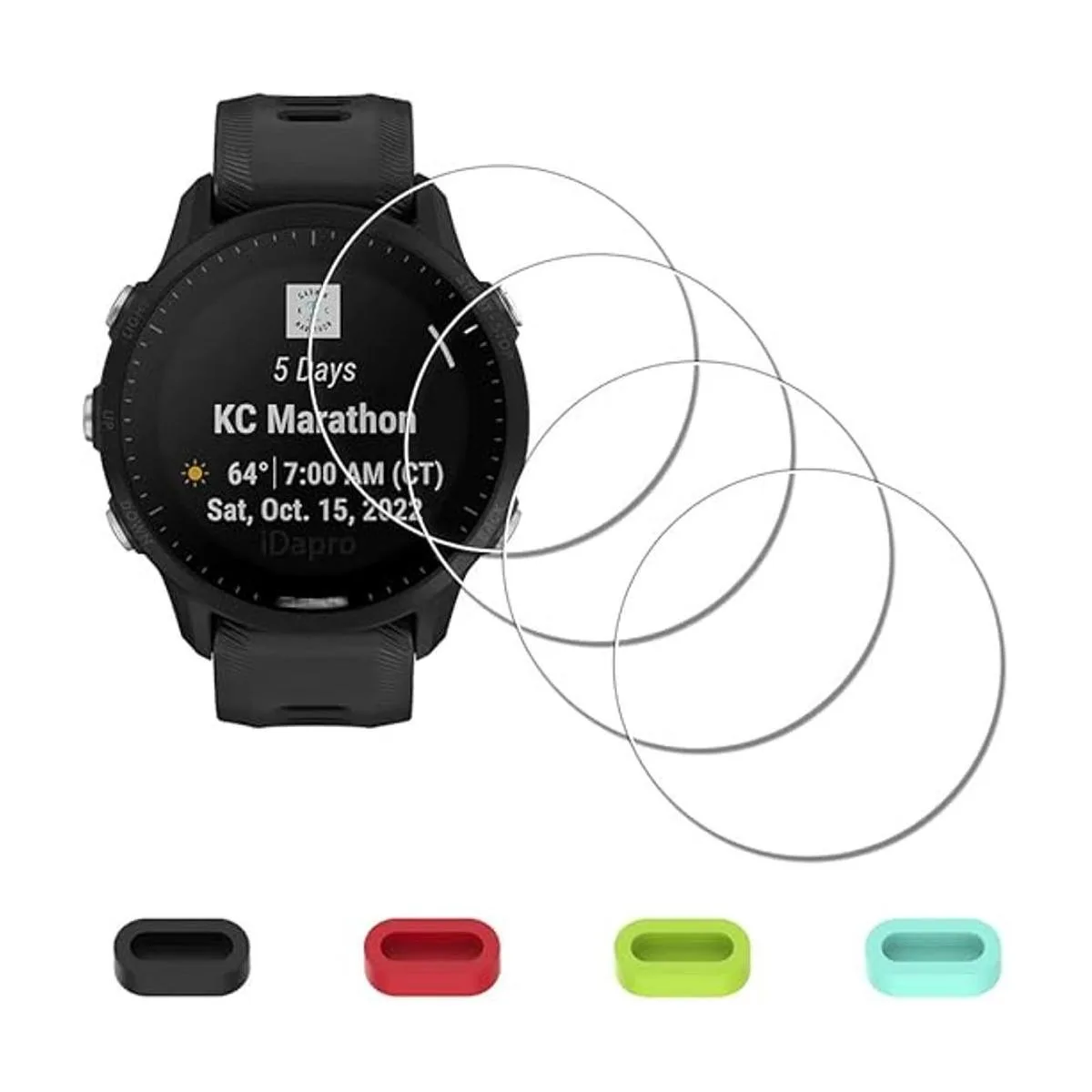 Compatible solo con reloj solar Garmin Forerunner 955 / 955, no apto para otros relojes. Incluye 4 piezas de vidrio templado con las cosas necesarias y 4 tapones antipolvo de silicona.