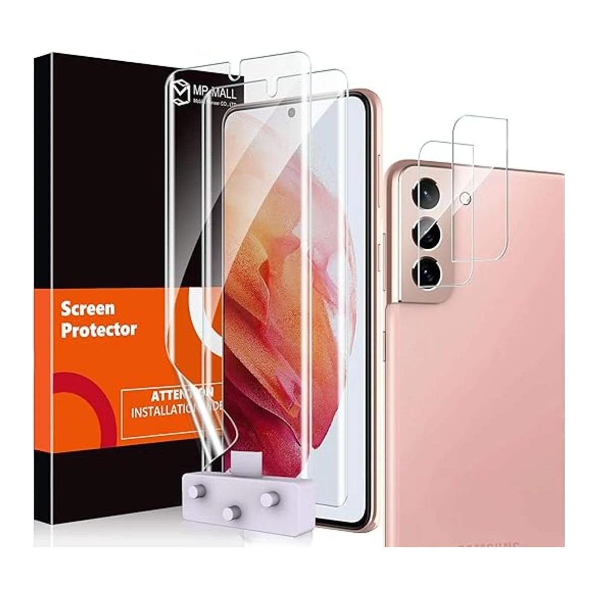 Paquete de 4 protectores de pantalla de TPU flexibles MPMALL 2 protectores de lente de cámara compatibles con Samsung Galaxy S21 5G de 6.2 pulgadas no para S21 Plus 5G, compatible con huellas dactilares ultrasónicas
