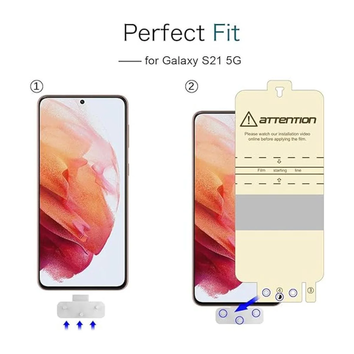 Modelo compatible: paquete de 2 protectores de pantalla de TPU flexibles y 2 protectores de lente de cámara para Samsung Galaxy S21 5G de 6.2 pulgadas. No es compatible con Galaxy S21 Plus 5G de 6.7 pulgadas / Galaxy S21 Ultra 5G de 6.8 pulgadas y cualquier otro dispositivo.