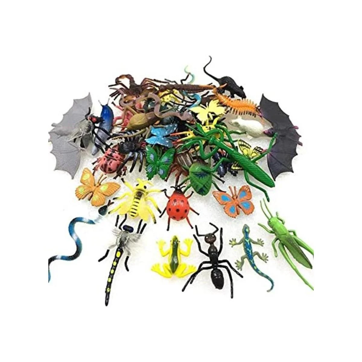 Paquete: recibirás un paquete de 43 piezas de insectos falsos e insectos, incluyendo escorpión, ciempiés, mantis, langosta, longicorn, araña, abeja, mosca, hormiga, oruga, mariquita, escarabajo de estiércol, sanguijera, cucaracha, grillo, libélula, geco, murciélago, rana, serpiente, ratón, mariposa colorida, etc. No hay insectos de plástico duplicados suficiente para truco de Halloween o rellenos de bolsas de golosinas, suministros de juego de fiesta temática de insectos, también son ideales para que los niños compartan con sus amigos
