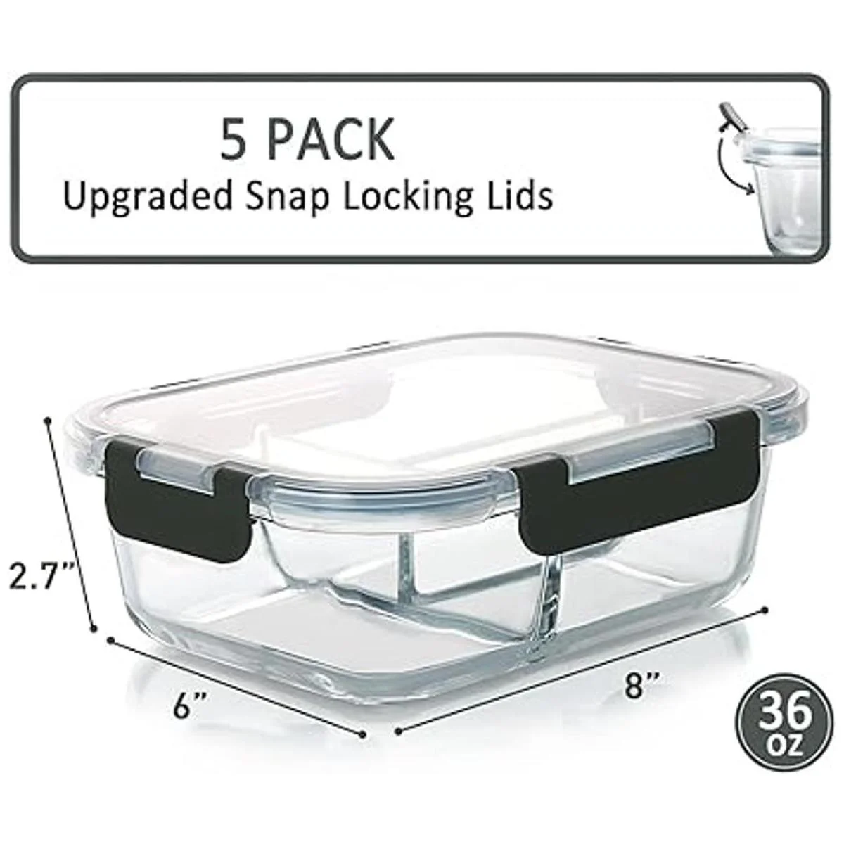 Paquete de 5, 36 onzas. Recipientes de vidrio para preparación de comidas, 3 compartimentos con tapas, recipientes de vidrio para almuerzo, lonchera para preparación de alimentos, caja Bento sin BPA, microondas, horno, congelador, lavavajillas (4.5 tazas, verde)
